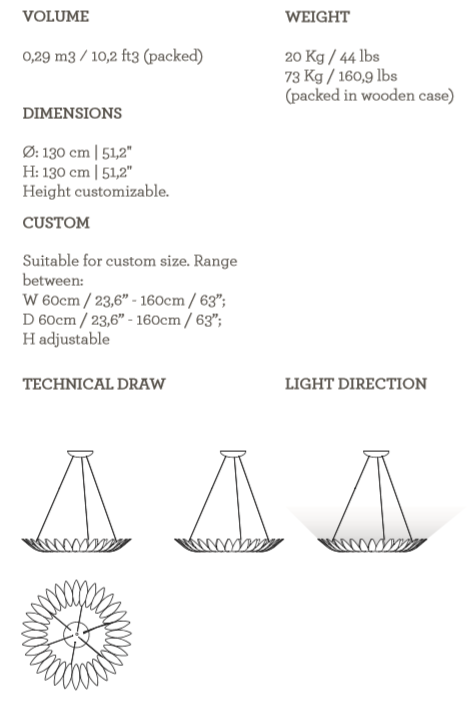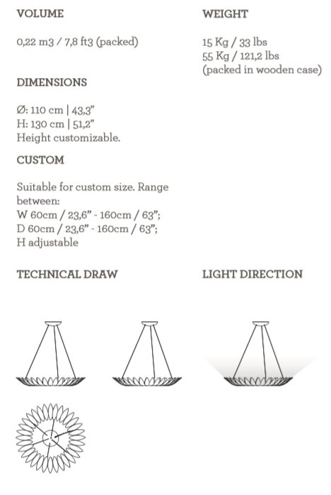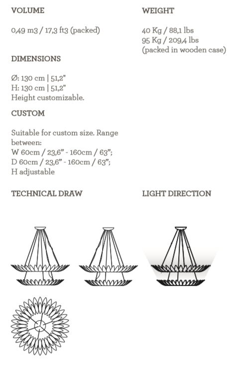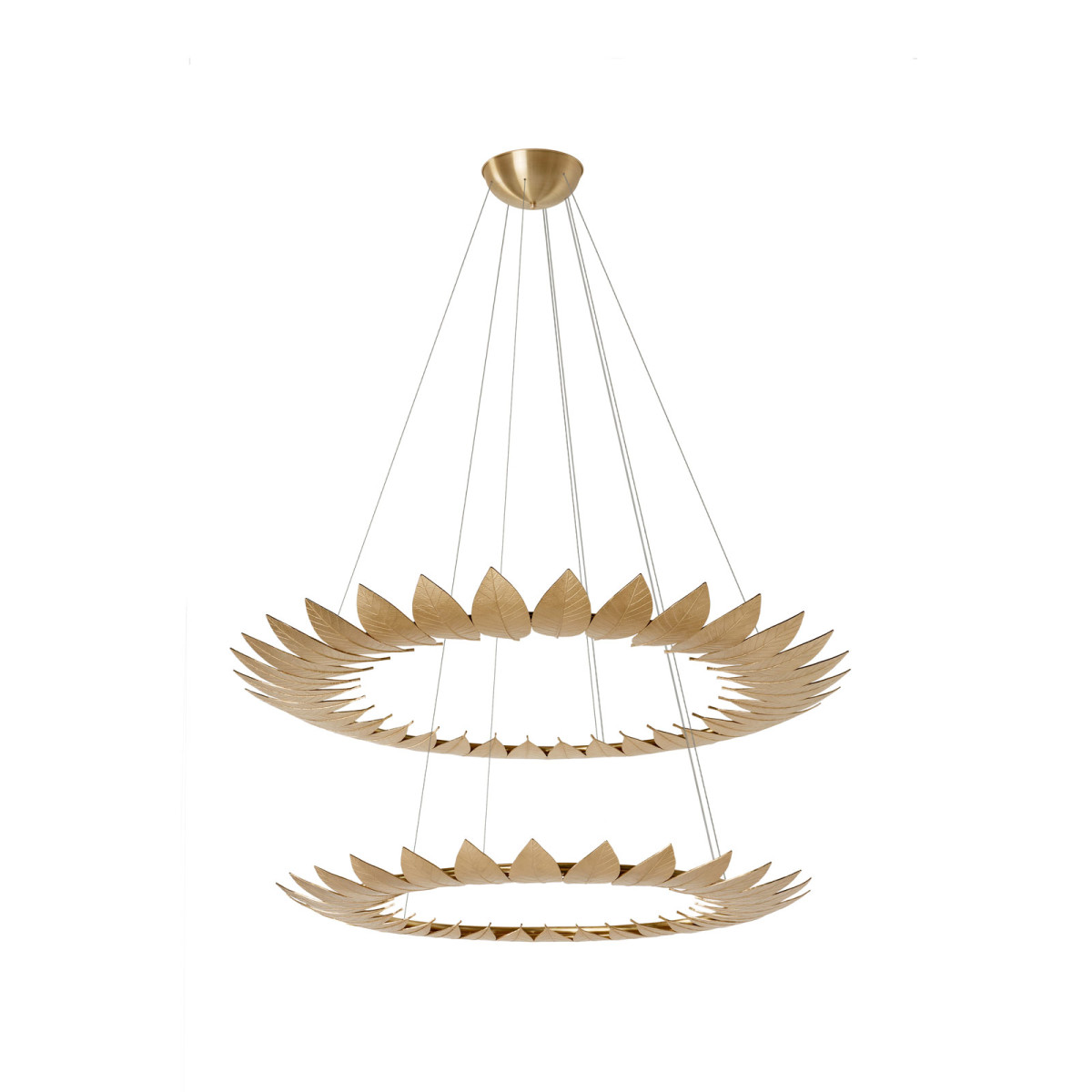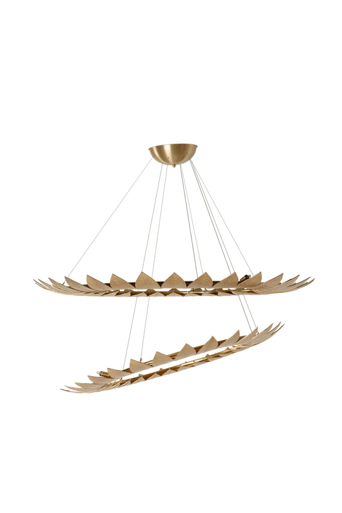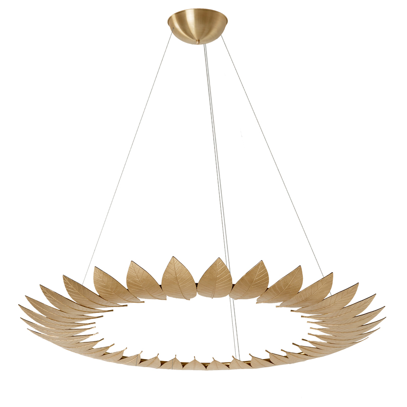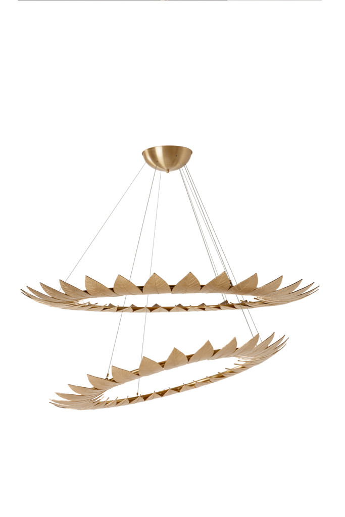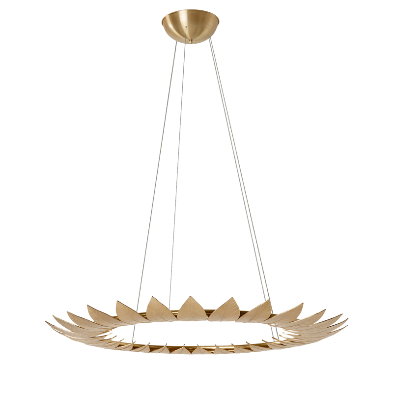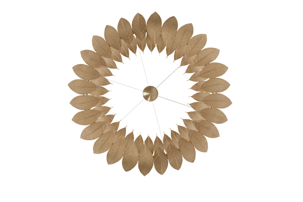 The Leaf Suspension Lamp’s golden frame, made from leaves molded in brass casting, evokes the falling of autumn leaves. The leaves are assembled by hand by artisans.