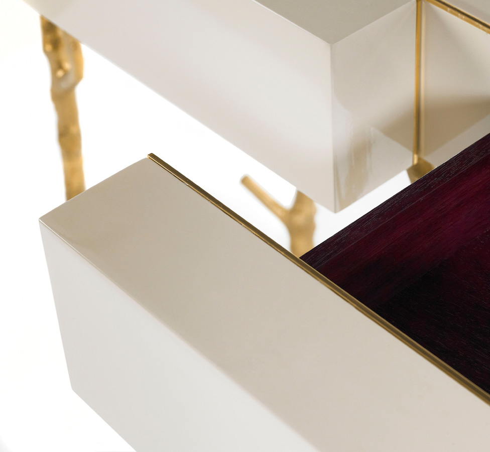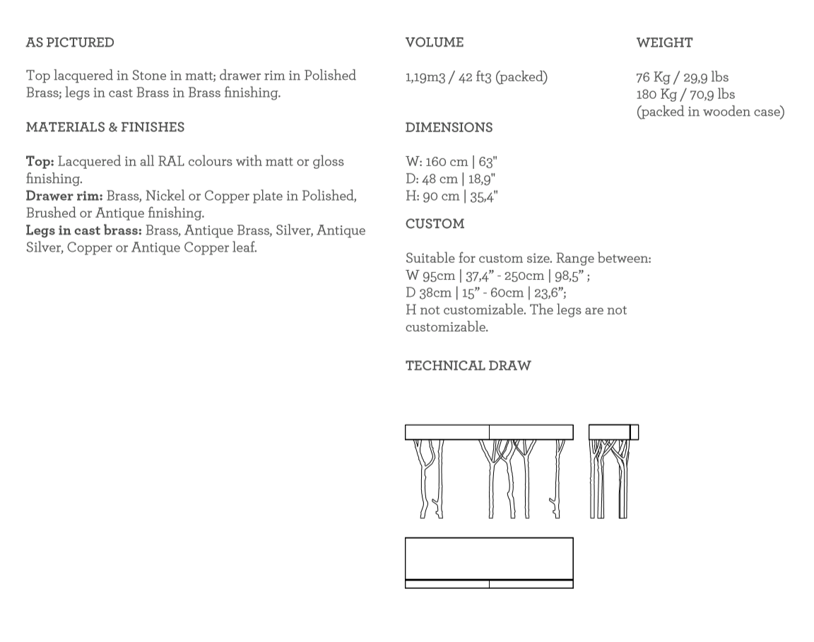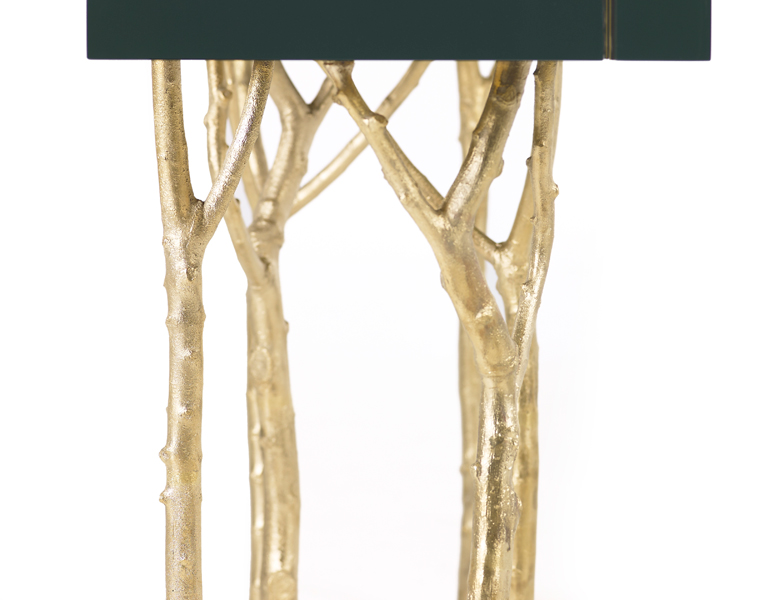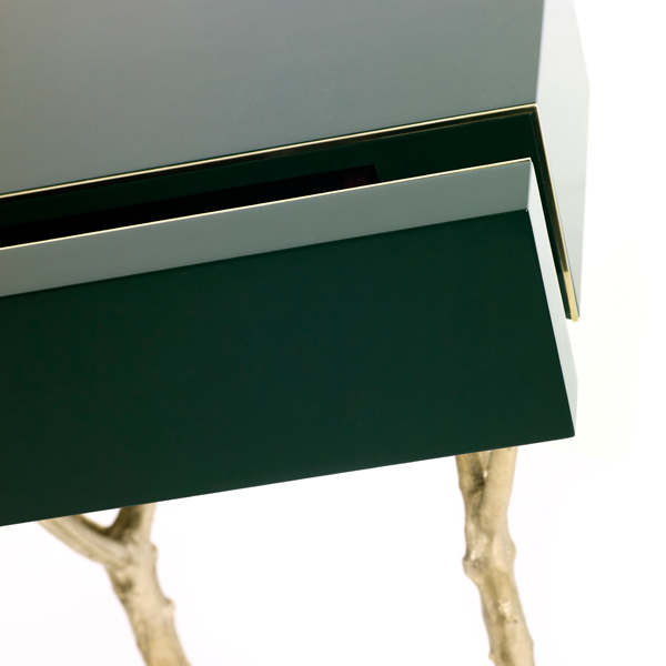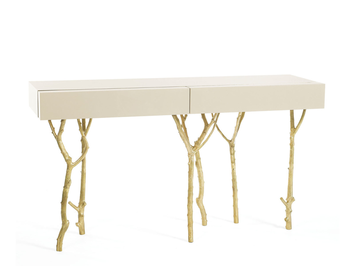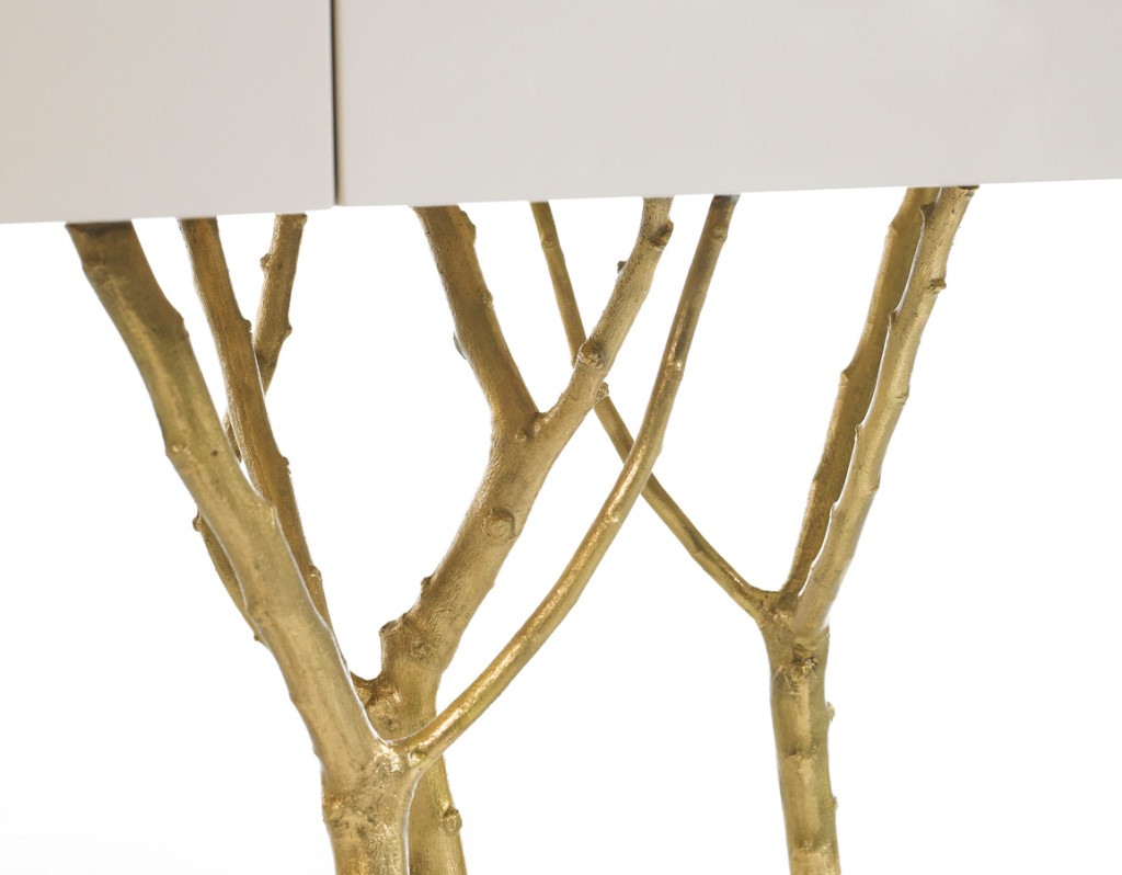 The Fig Tree Console is a tribute to Nature’s graciousness. The legs are made from fig tree branches in brass casting mold. The lacquered top has two drawers with purpleheart wood veneer lined with a subtle metal rim.