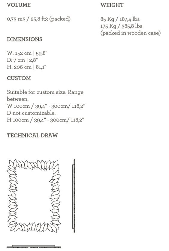 The Leaf mirrors’ golden frame, made from leaves molded in brass casting, evokes the falling of autumn leaves around a pond. The leaves are assembled by hand by artisans.