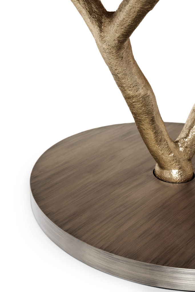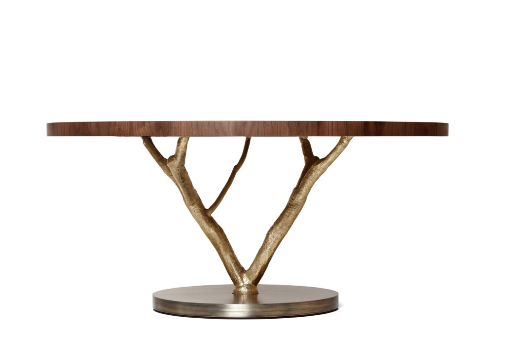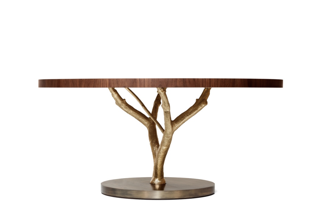 Nature’s forms, materials and textures are immortalized in striking fashion in this piece. The structure is molded in brass casting from magnolia tree branches, providing function to its natural form. The metal base and wood marquetry top deepens the piece’s connection with earthy materials. The softness and ruggedness of the materials is a testament of Nature’s paradox: complex, yet simple.