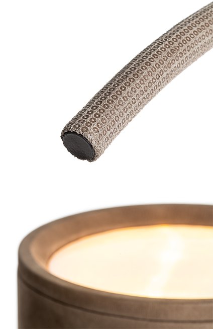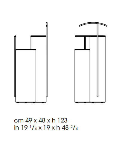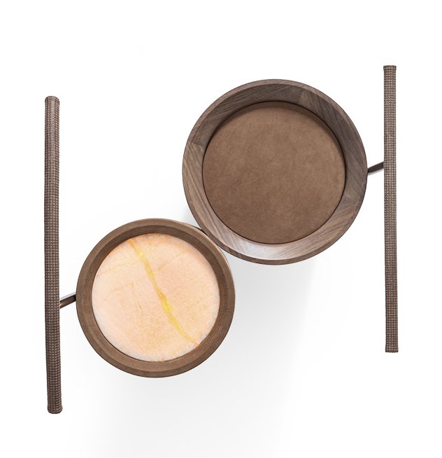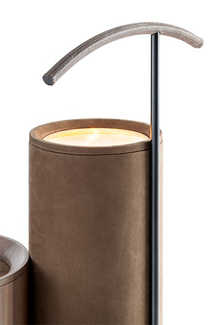 Sculptural valet that completes the sleeping area and the entrance, a compact island made up of two cylinders of different heights and rods covered in non-slip leather.