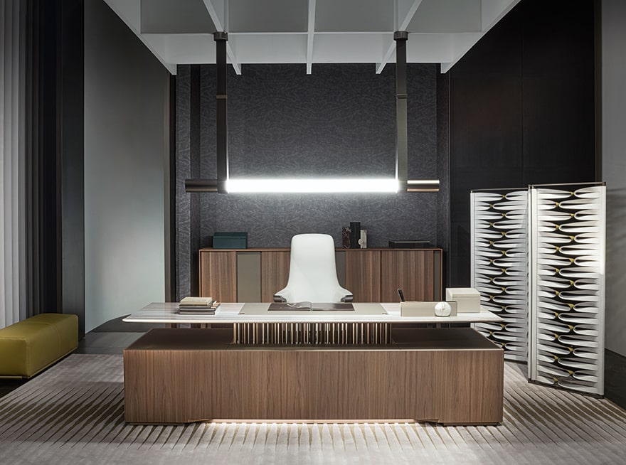 Executive desk with a Canaletto walnut structure and top supported by a metal structure with 158 cylinders in three different sizes and finishes, with lighting and electrification systems.