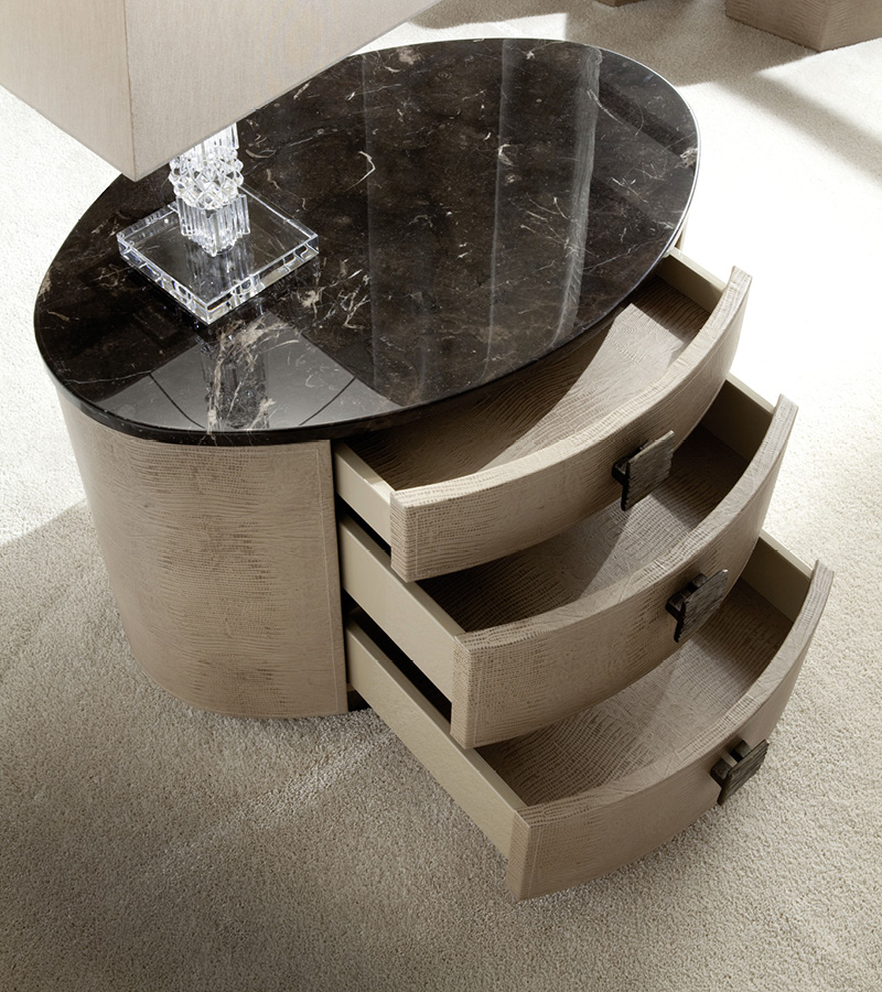 Night table in armadillo printed leather with dark emperador marble top. 3 full extension drawers with bottom in armadillo printed leather. Bronze brass handles.