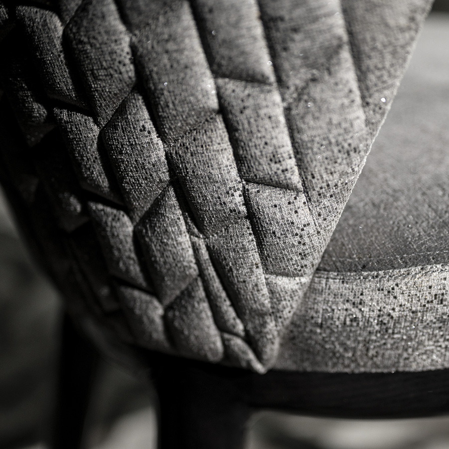 Fully upolstered side chair in solid beech. 4 legs with details in gold chrome stainless steel. Wooden base with Giorgio Collection metal logo.