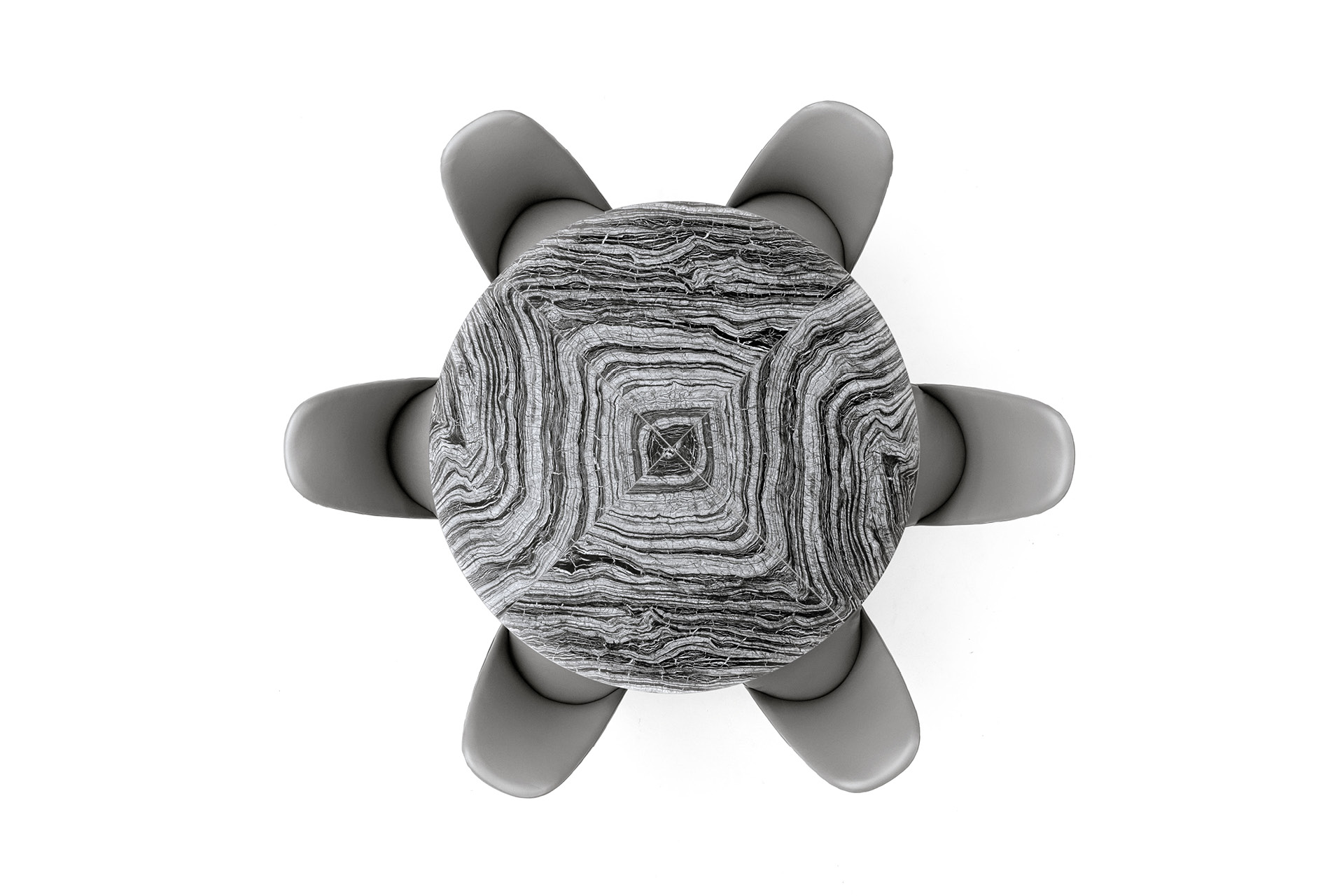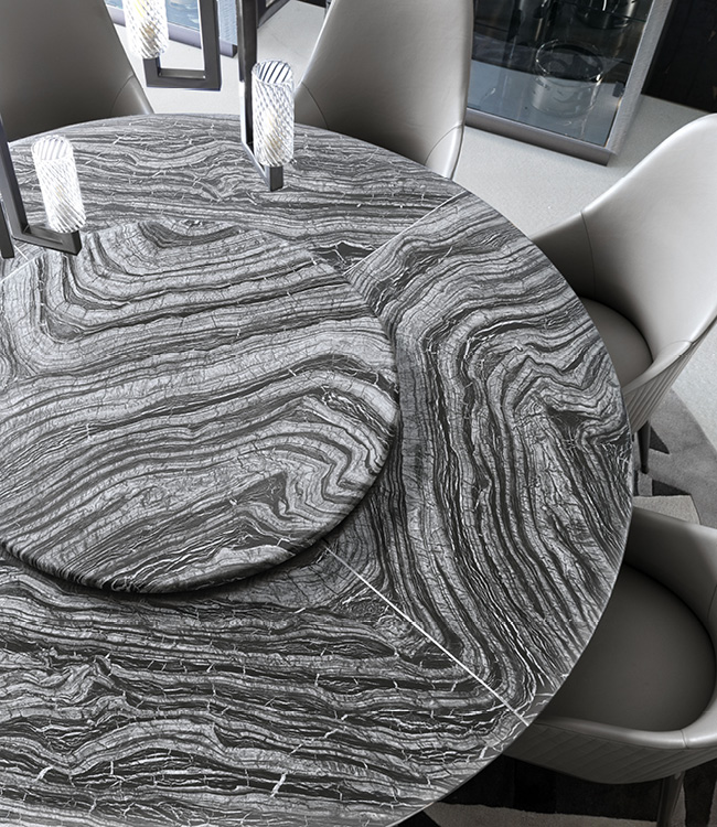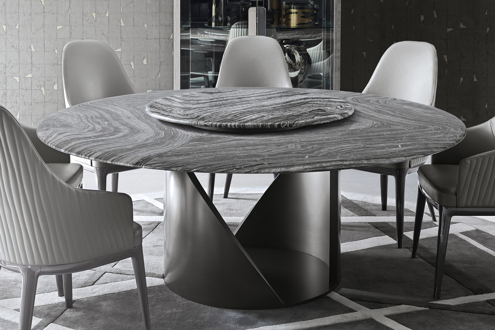 Black Kenya Marble Top Round Table. Base details in satin black nickel stainless steel with lasered Giorgio Collection logo.