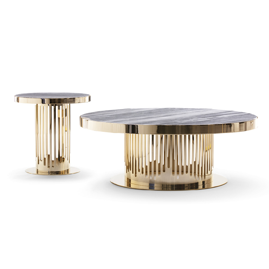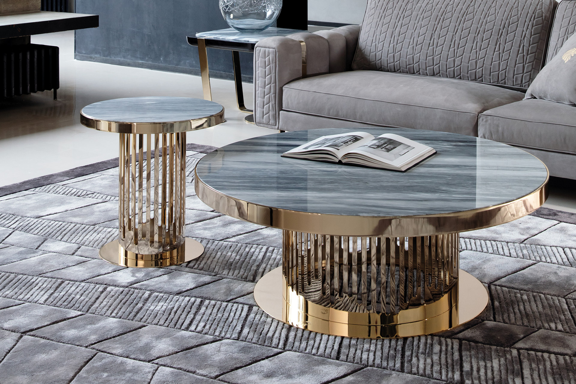 Round cocktail table in 24k gold chrome stainless steel. Giorgio Collection logo on the metal base.