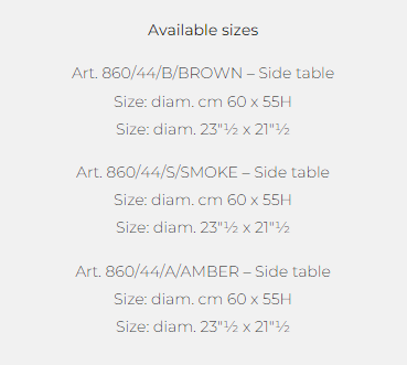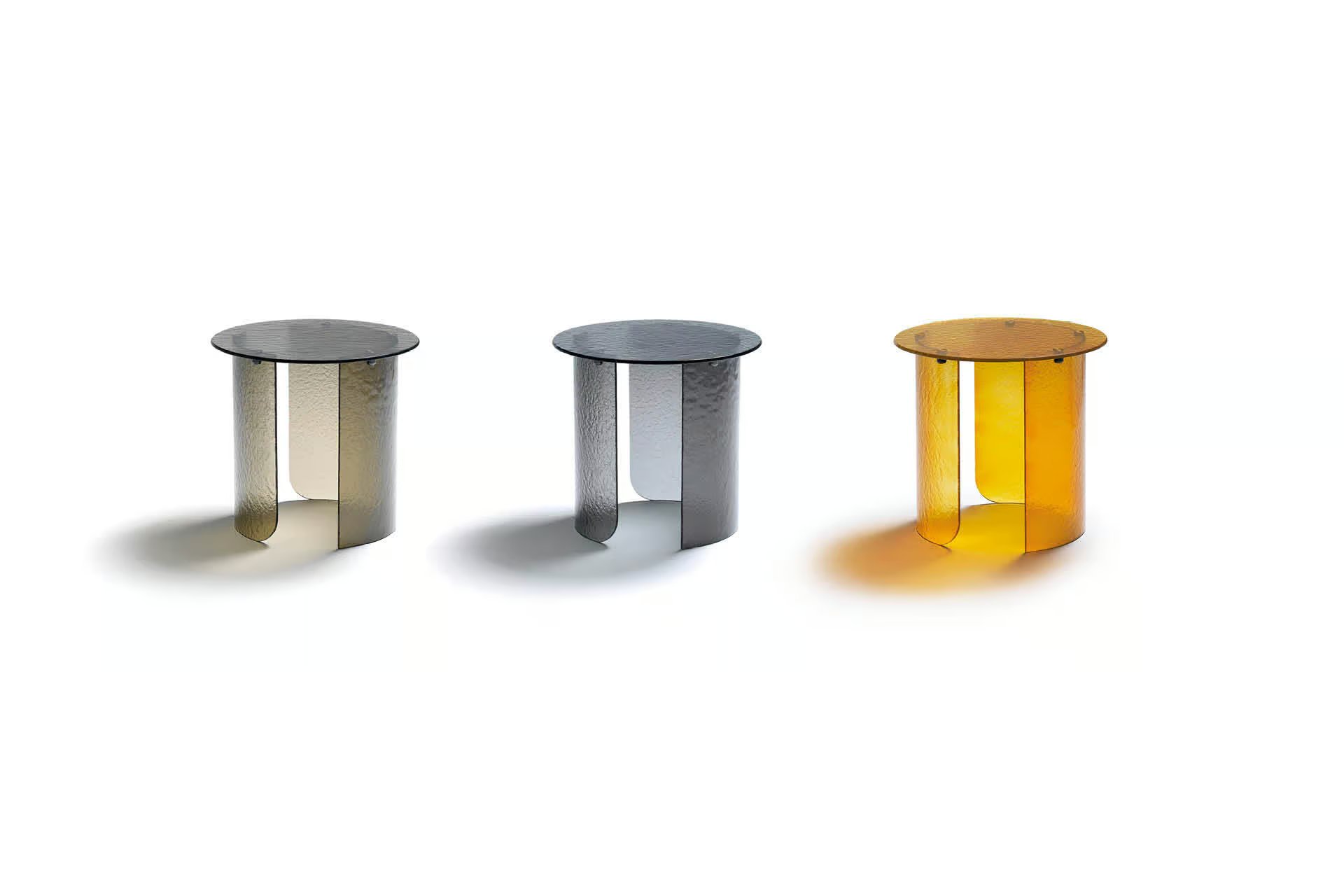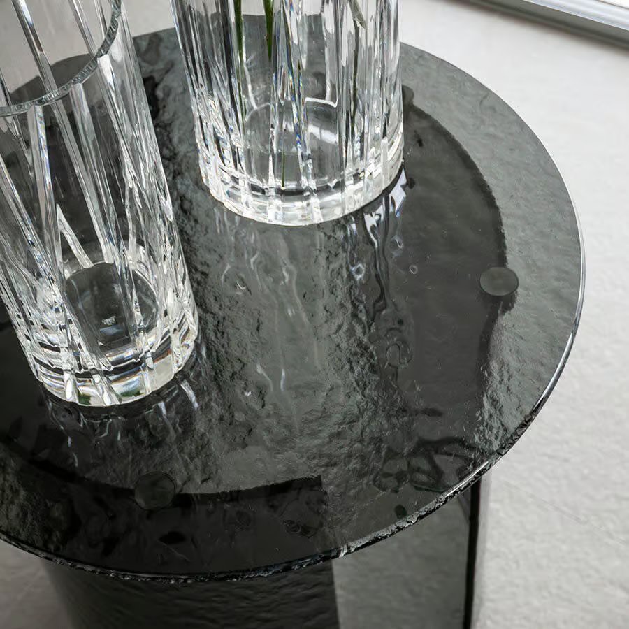 Round side table with top and base available in brown, smoke or amber hand hammered fused glass.