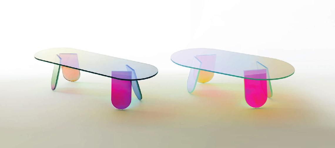 Tavoli alti, bassi e consolle in cristallo stratificato e incollato, con una speciale finitura multicromatica cangiante, la cui colorazione varia in funzione dell’angolo di incidenza della luce e del punto di osservazione. Ne risultano oggetti dall’aspetto magico ed etereo. Nei tavoli alti le basi sono smontabili e vengono fissate ai piani tramite piastre metalliche, dissimulate da decori circolari con finitura coprente.
