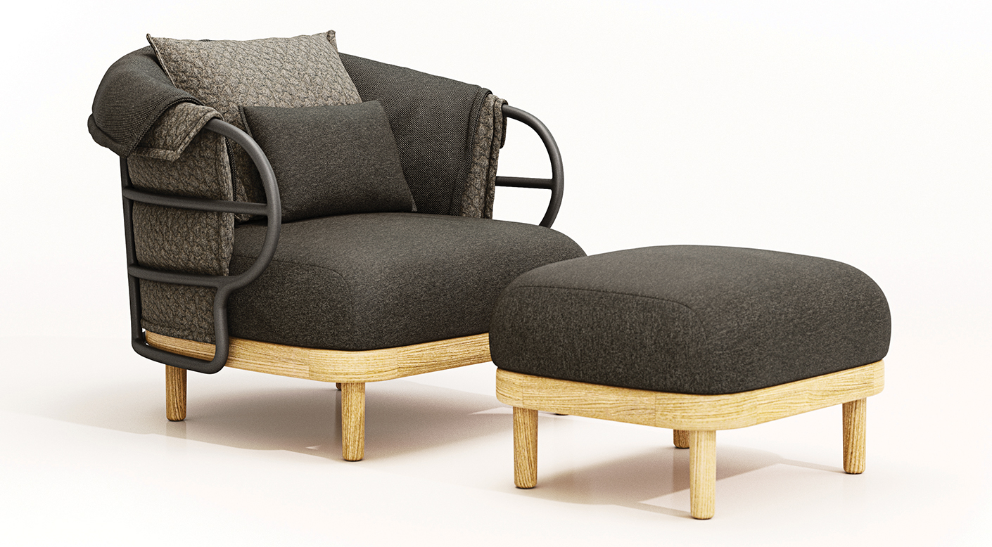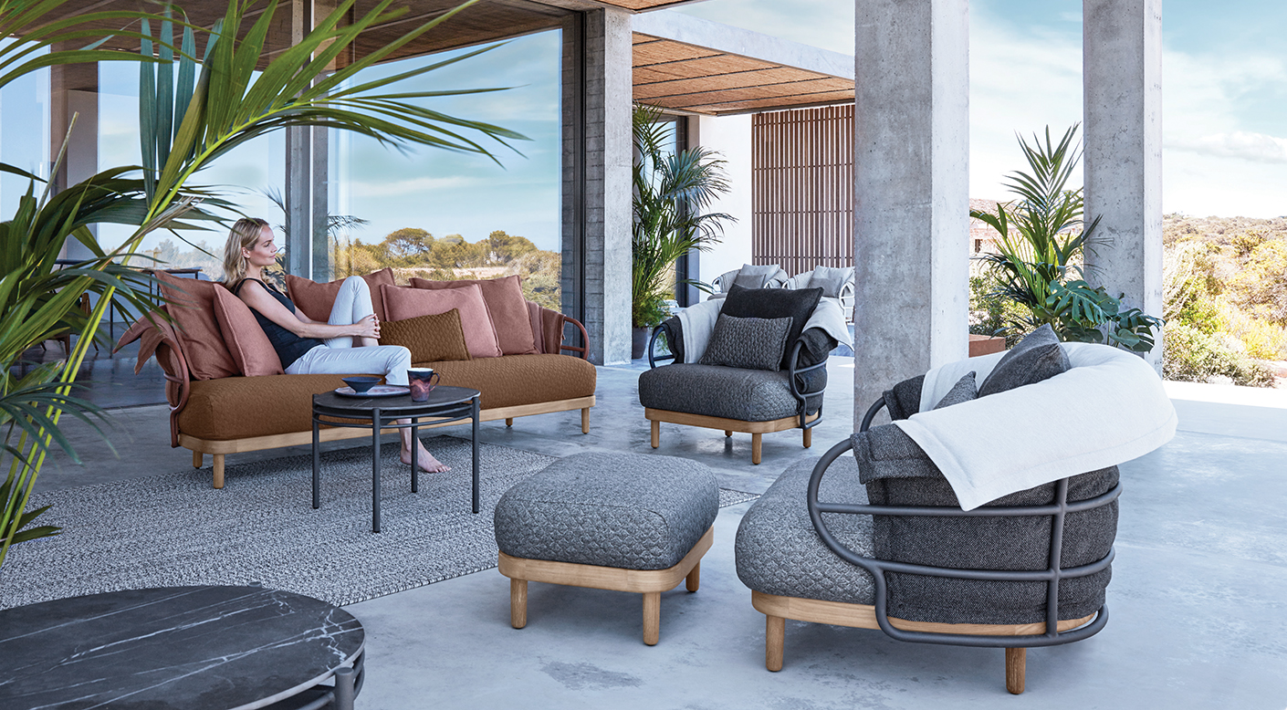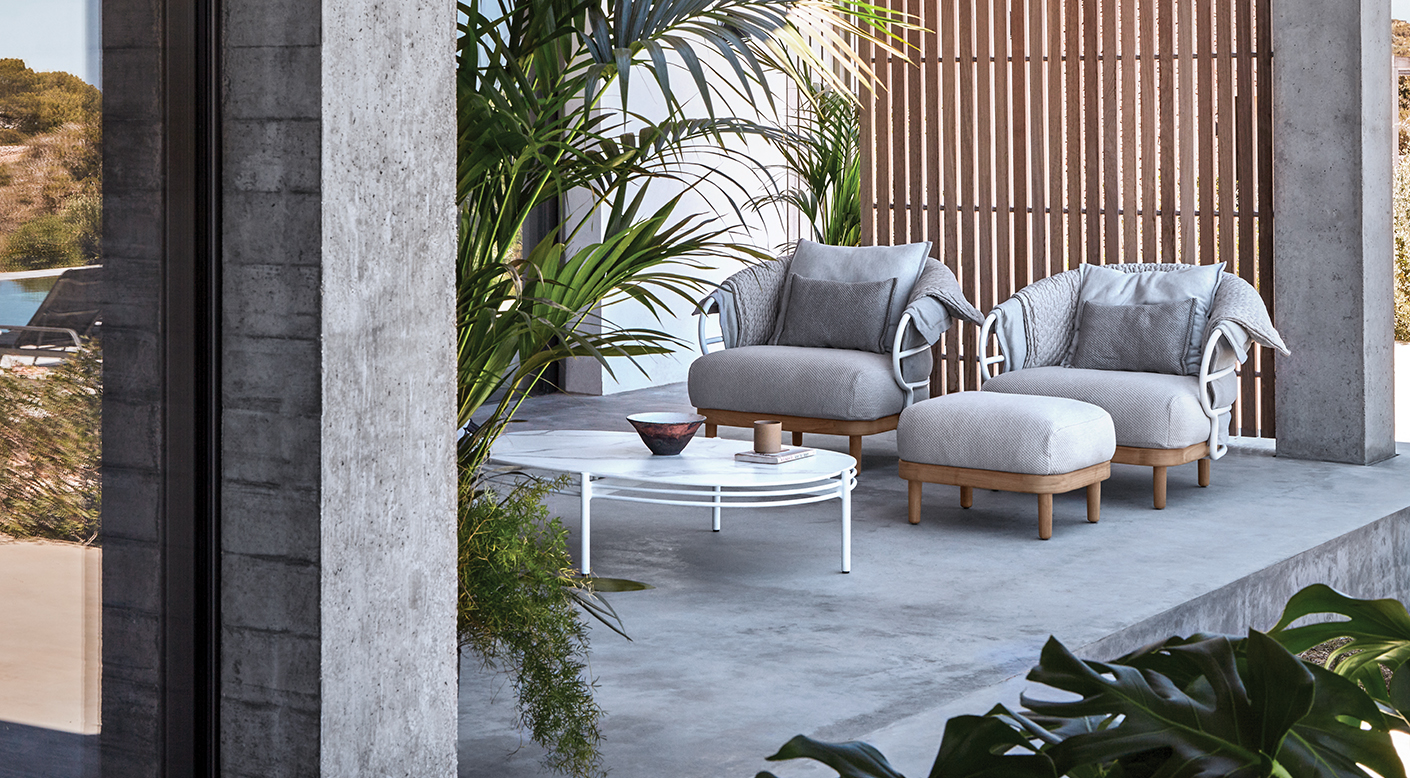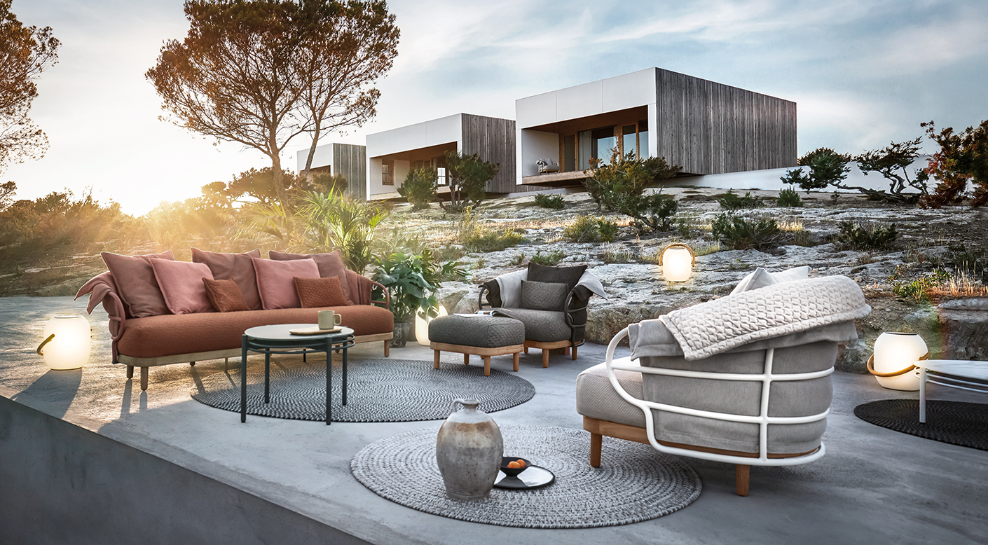 Like the shifting sands of the desert, the Dune collection combines soft lines and repeating patterns in an outdoor seating and dining concept using a collection of knitted fabrics designed by Sebastian Herkner. A bohemian influence defines the style, with softness and spontaneity added via specially developed fabrics made with 3D knitting technology