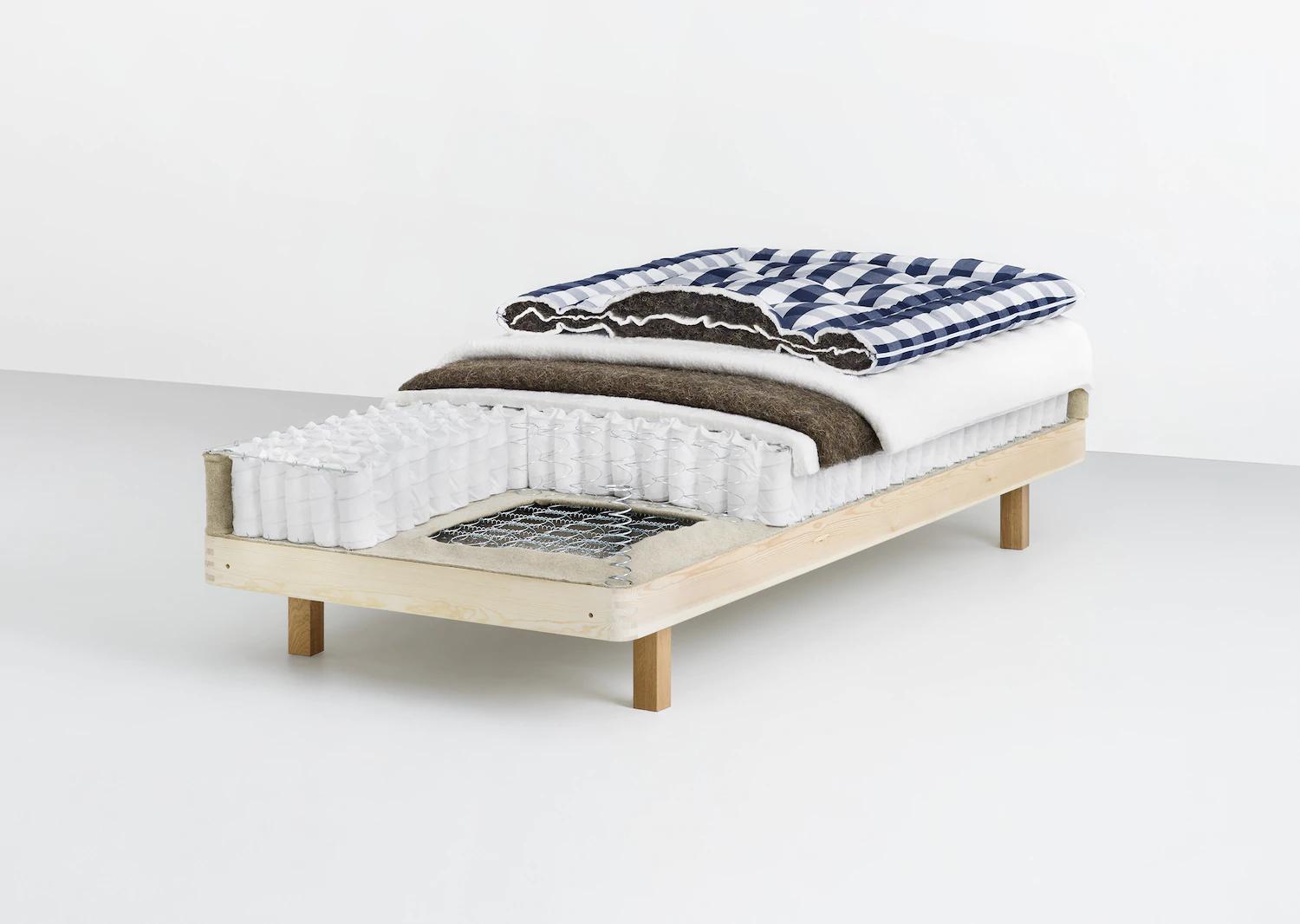 Marquis的床架底座中,用亞麻包裹,具有消音并導(dǎo)出靜電功能。堅(jiān)固的指形連接方式將松木木板牢牢鎖定,組成了結(jié)實(shí)的木質(zhì)床框。所有的結(jié)構(gòu)最終都包裹在我們?nèi)彳浤陀玫募兠廾媪现校嬲龅骄趦?nèi),簡(jiǎn)于形。