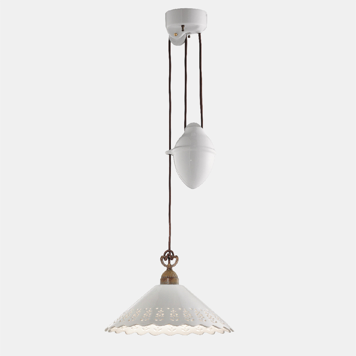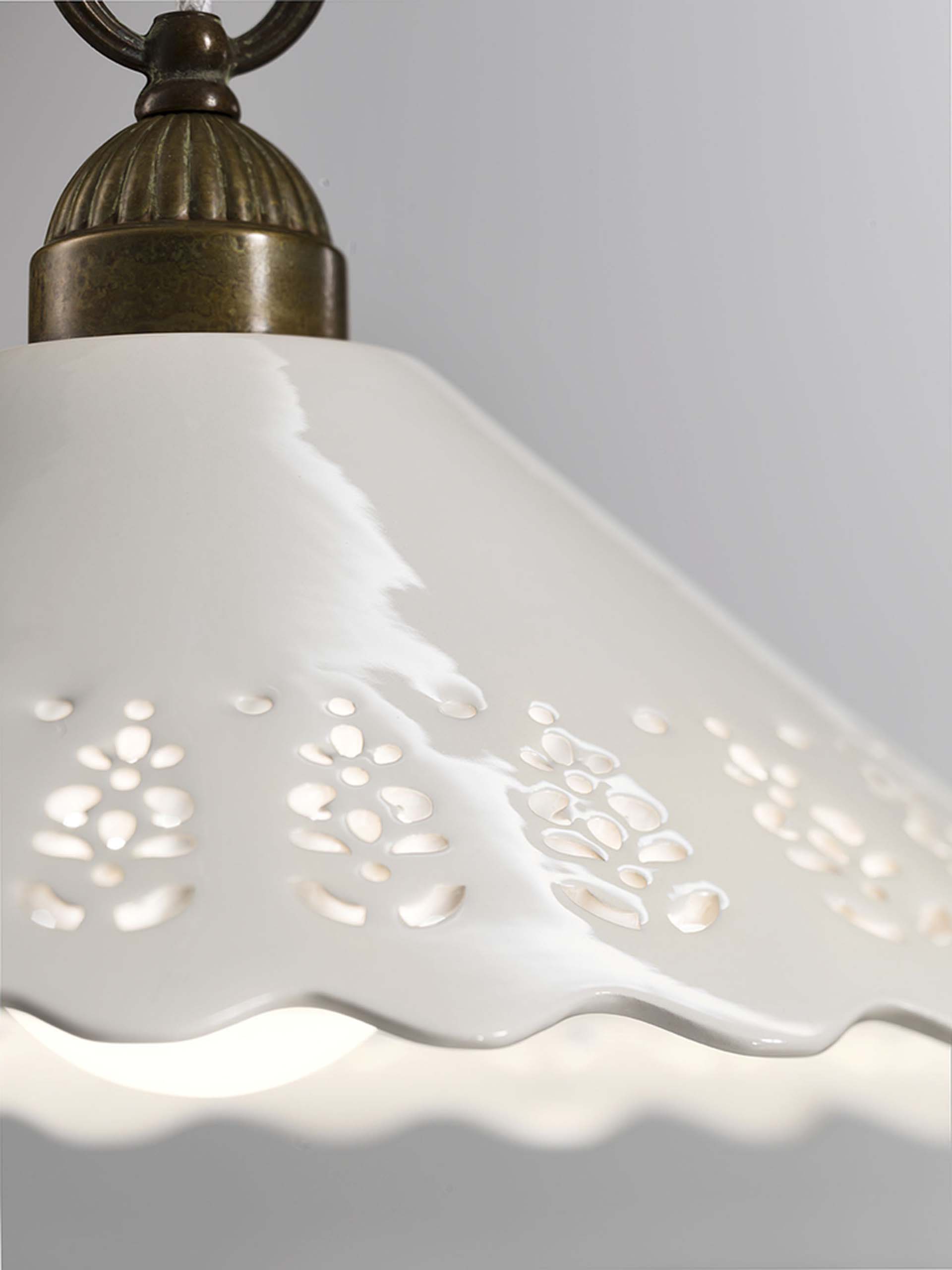 I ricami sapientemente traforati sulle preziose ceramiche di Bassano conferiscono un grande valore estetico alle lampade della collezione Fiori di Pizzo, emblemi di un classicismo rivisitato in chiave moderna. La ricercata lavorazione consente, in fase di illuminazione, la creazione di giochi di luce sulle pareti proiettando fiori e decori.