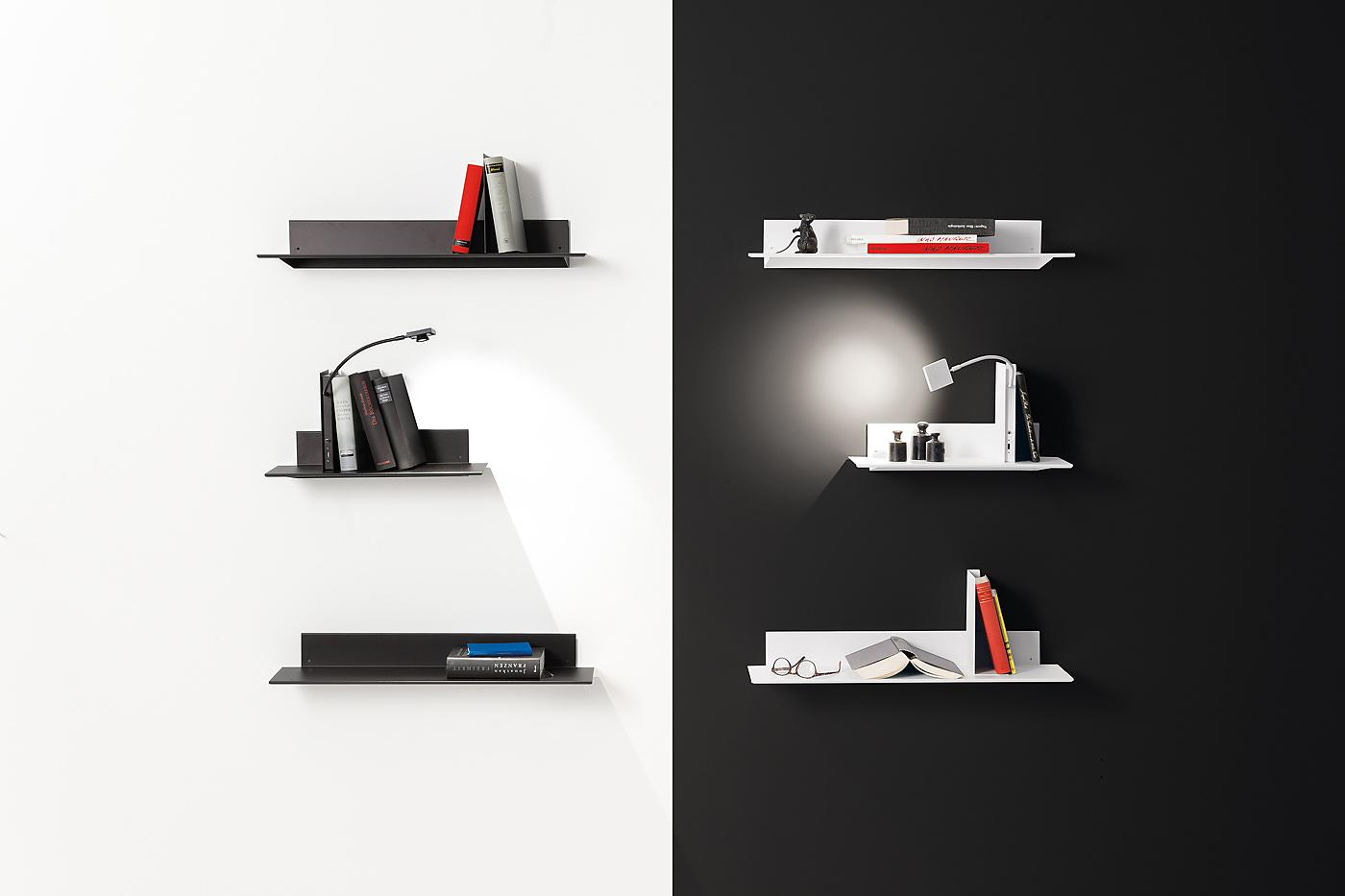 The body of the lamp serves as bookend. The flexible metal arm allows variable adjustment of the lamp head. Anodised aluminium in black or silver, metal.