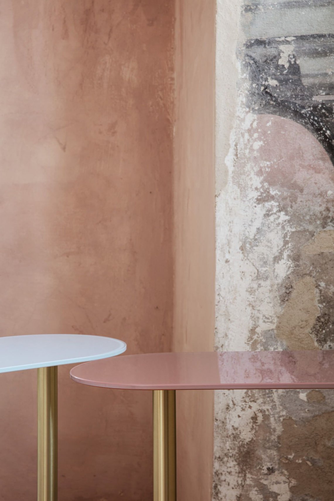 Corvetto is a minimal and functional object, slim but strong with an overhanging top that can be moved to offer occasional support to various activities and in different contexts. On its own or in small groups, it quickly organises the accessory and service space. The side table has its compositional harmony thanks to the similar shapes for both rounded faces: the compact base and the wide top.