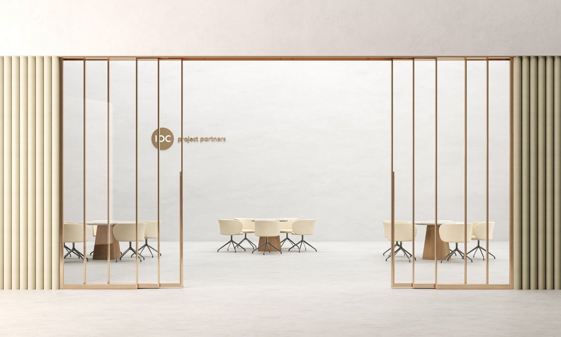 The Privé collection now includes a new dividing wall with synchronised telescopic opening. Privé, with its sliding module system, enables workspaces to be transformed, divided or opened, rendering them suitable for a range of functions: representative spaces, meeting rooms, executive offices or private areas. It consists of perfectly overlapping glass modules with a light aluminium frame or wooden panels which simultaneously slide with smooth, silent movements. The synchronised telescopic wall can be composed of one fixed and a maximum of three sliding modules, creating a partition of up to 4.6 m. Two mirrored groups of sliding modules can cover a distance of up to 9.2 m.
