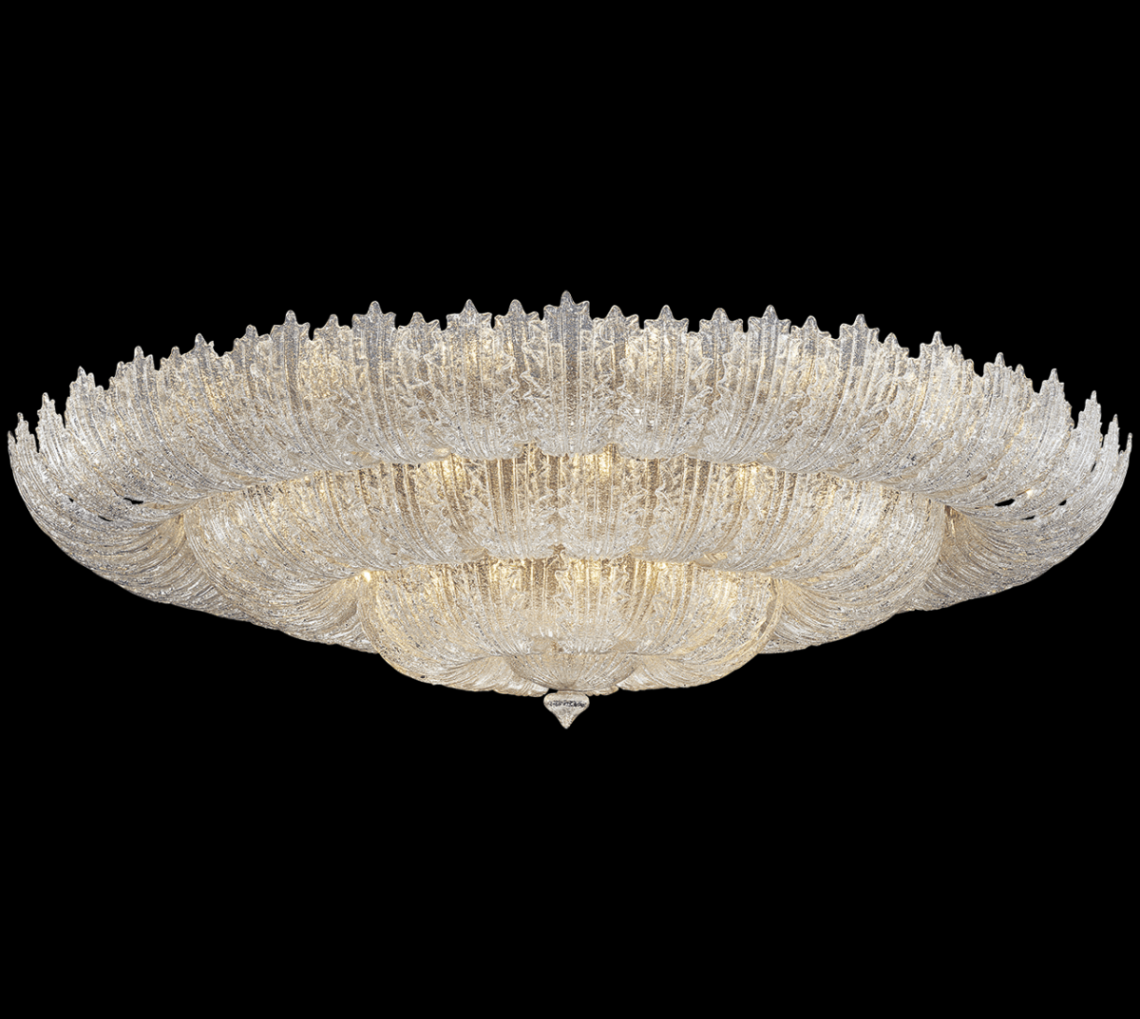 Ceiling lamp with satin glass leaves and metal with nickel finish. Available in different dimensions and colours. Opera Classic Collection.