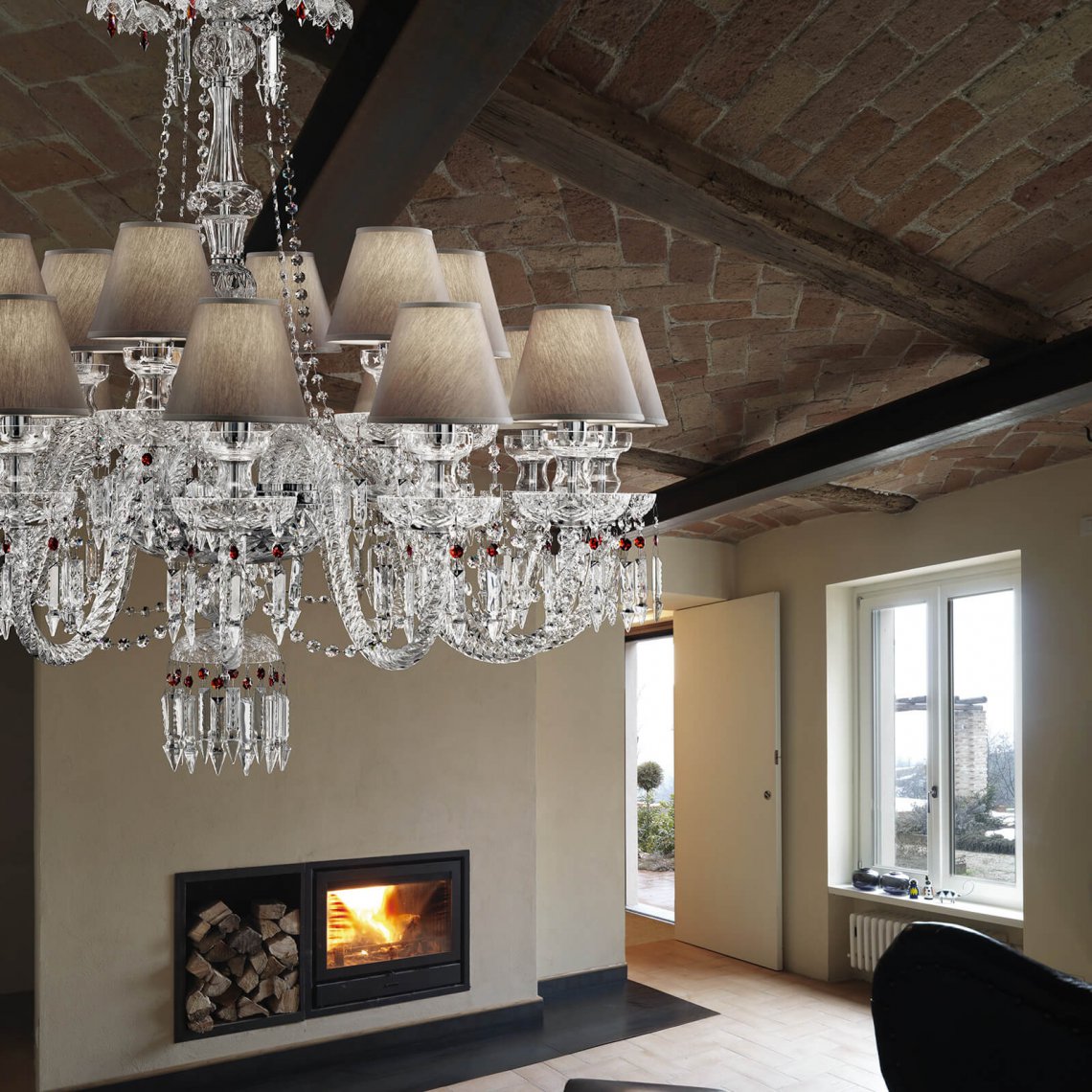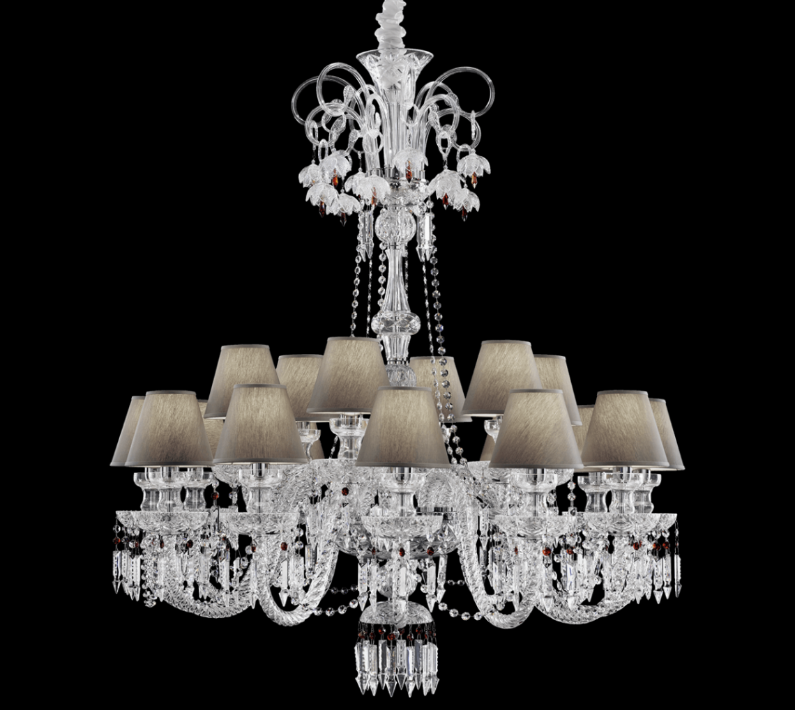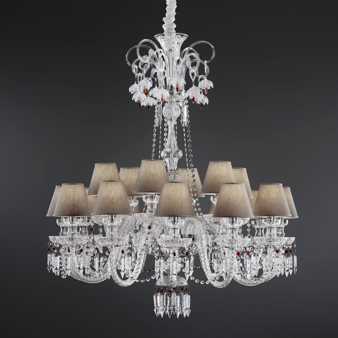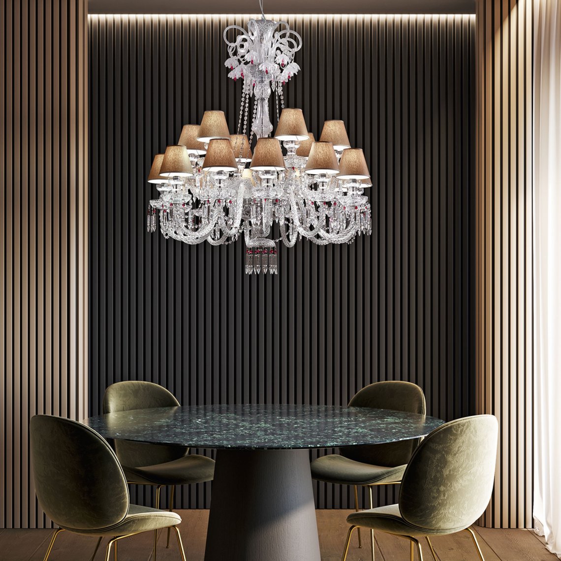 Chandelier in carved crystal and glass, metal with chrome finish, dove fabric shades. Swarovski Elements pendants. Available in different dimensions and colours. Opera Classic Collection.