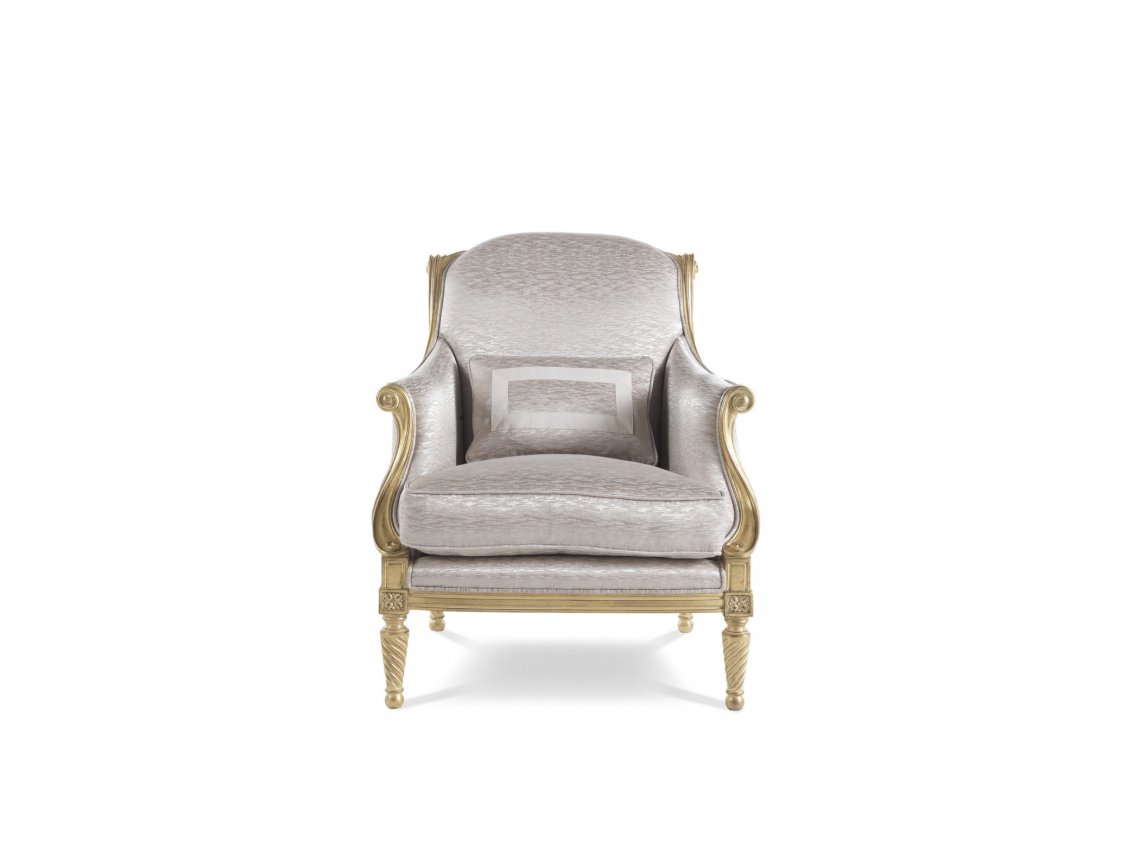 ARMCHAIR WITH STRUCTURE IN HAND-CARVED BEECHWOOD WITH PATINATED ANTIQUE GOLD FINISHING. PADDING IN FOAM. UPHOLSTERY IN FABRIC.