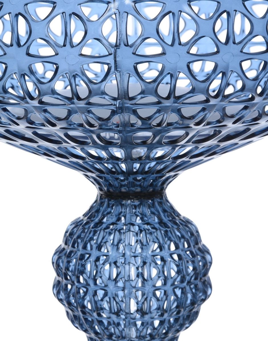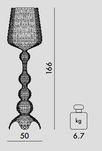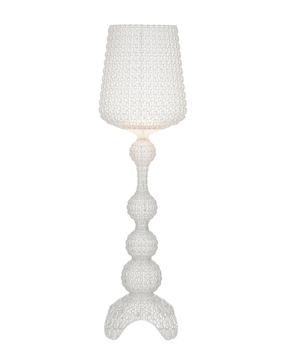 La lampada a piantana Kabuki è realizzata ad iniezione che consente di avere una struttura a trama che riproduce il pizzo con una particolare superficie traforata da cui si diffonde la luce. Disponibile nelle versioni indoor e outdoor.