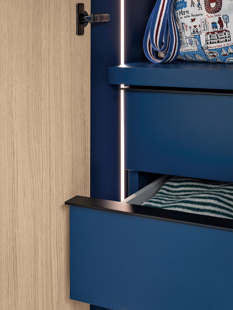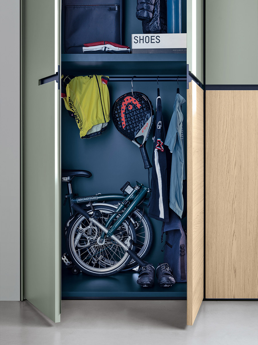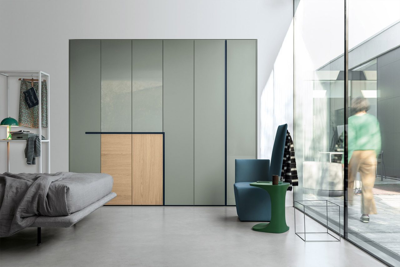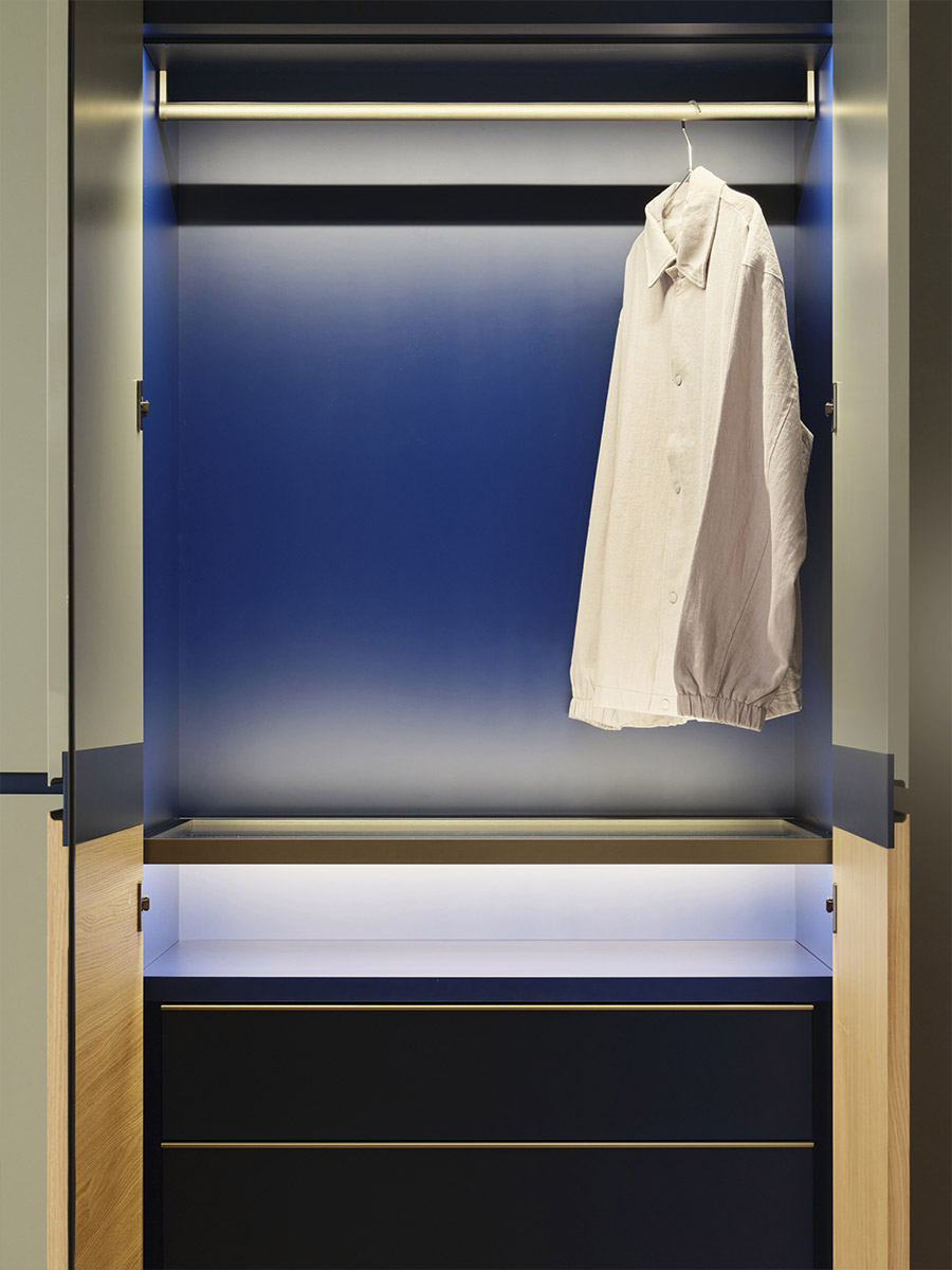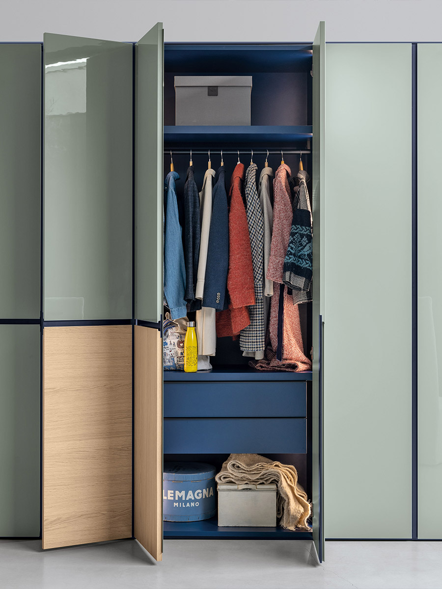 Aria is a wardrobe and walk-in wardrobe system that allows a combination of different units. The structure, with closed or through sides in Black or Bronze aluminium, can be closed by sliding or hinged doors in a choice of materials, also in aluminium with flush glass. Wardrobes and walk-in wardrobes can be fitted with suspended or floor-standing drawer units, storage racks, glass and aluminium pull-out shelves, boxes and customised accessory holders.