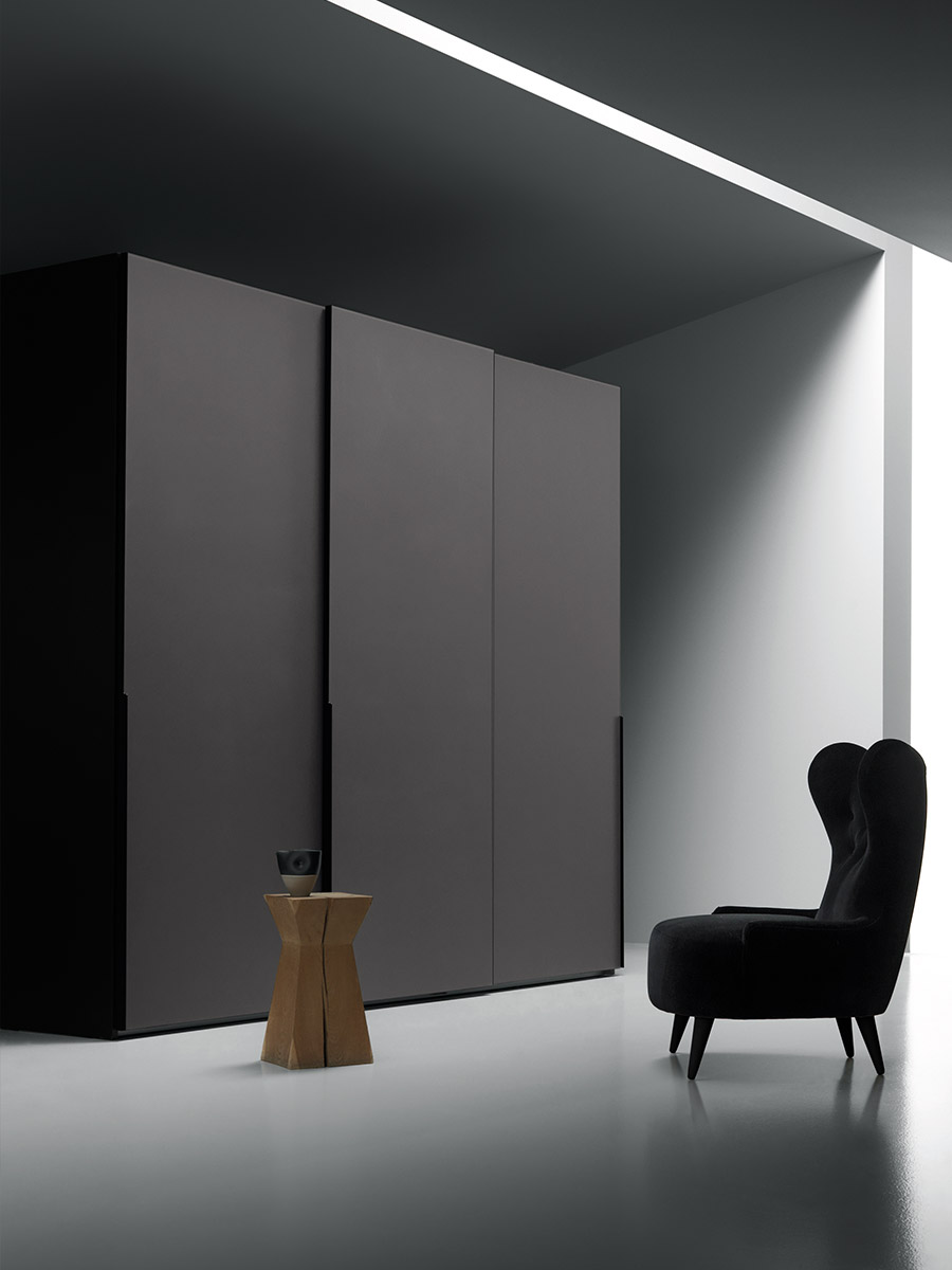 Aria is a wardrobe and walk-in wardrobe system that allows a combination of different units. The structure, with closed or through sides in Black or Bronze aluminium, can be closed by sliding or hinged doors in a choice of materials, also in aluminium with flush glass. Wardrobes and walk-in wardrobes can be fitted with suspended or floor-standing drawer units, storage racks, glass and aluminium pull-out shelves, boxes and customised accessory holders.