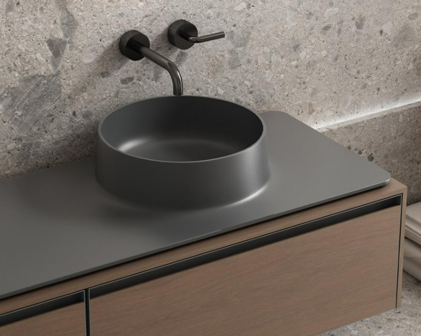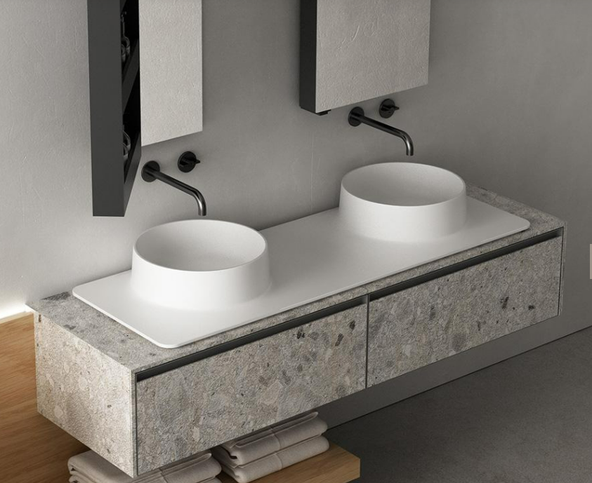 Integrated washbasin on Solid Surface top, which can be made to measure. Available also with double basin.