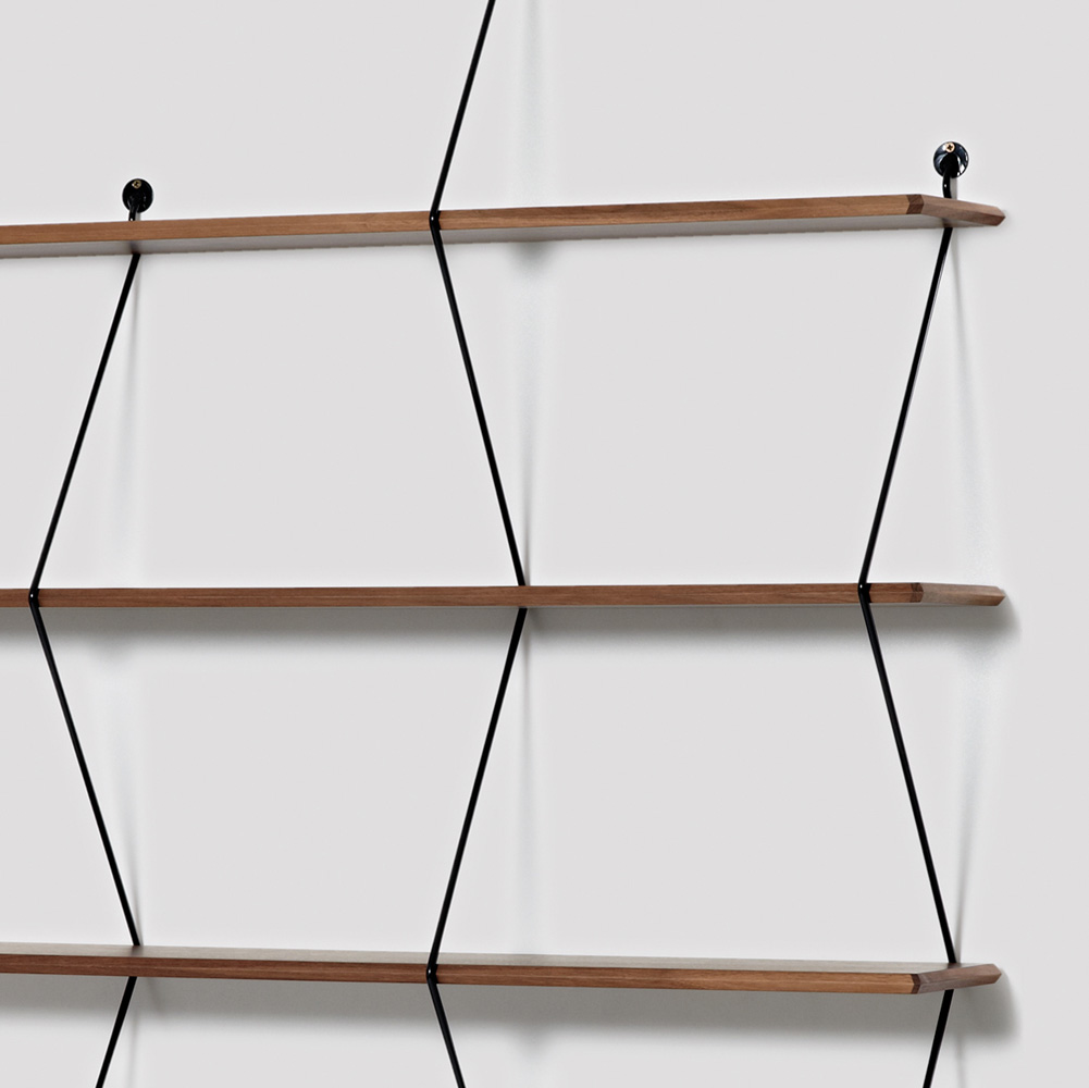 Climb is an ingenious shelving system made of beveled wooden boards supported by metal wires.