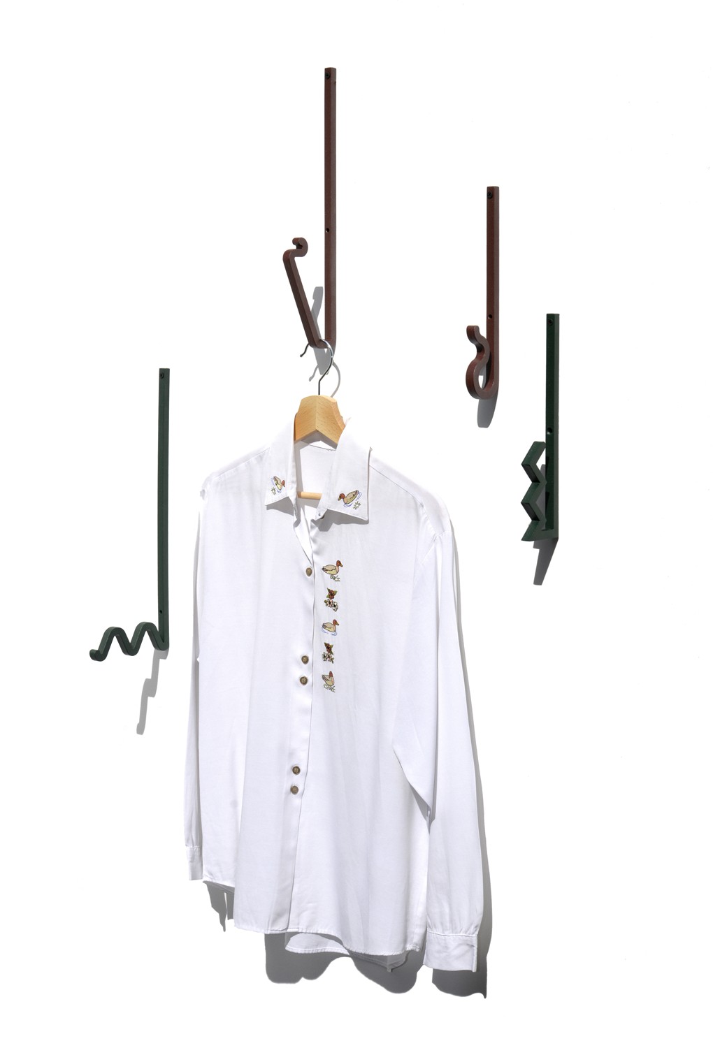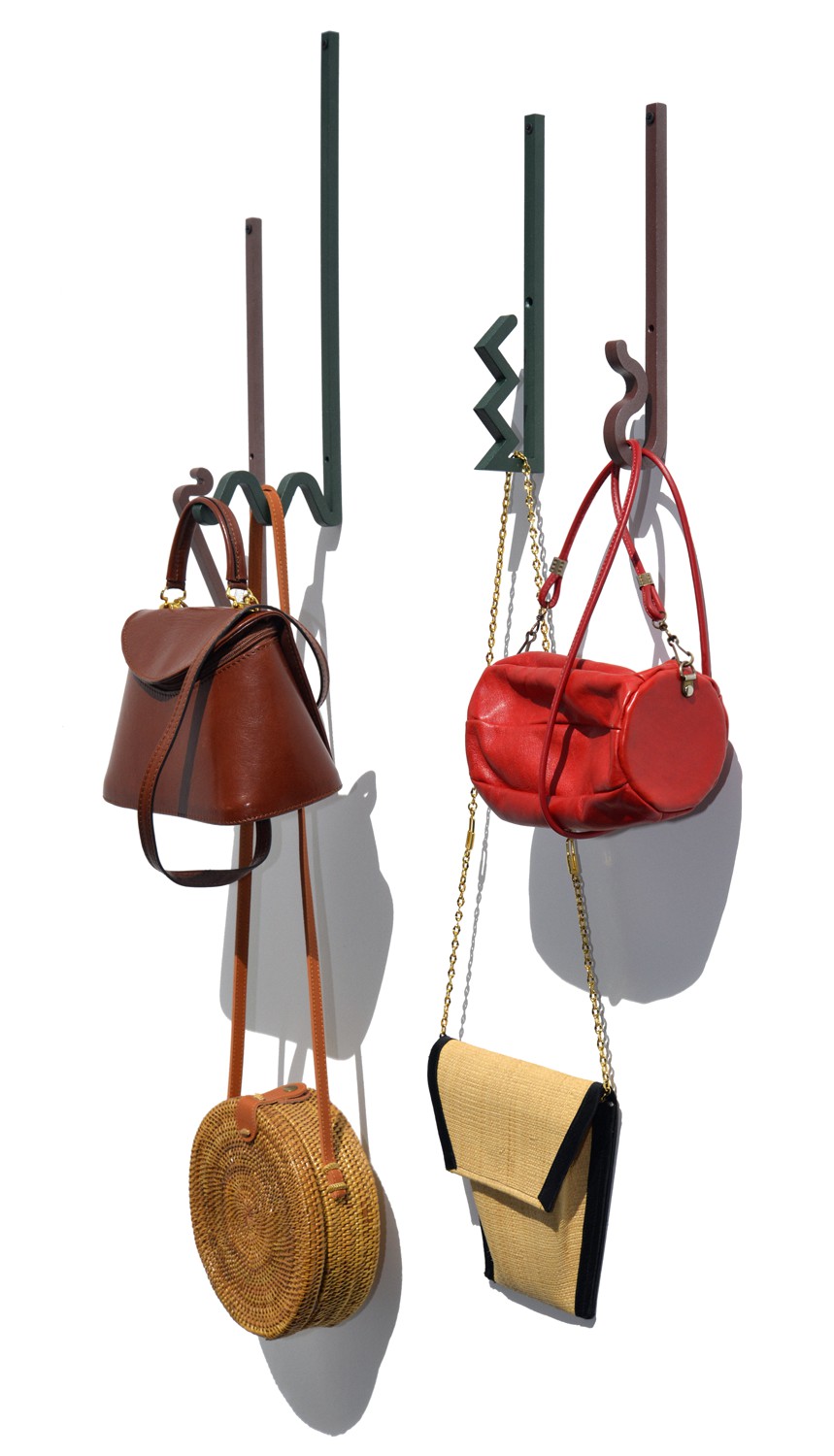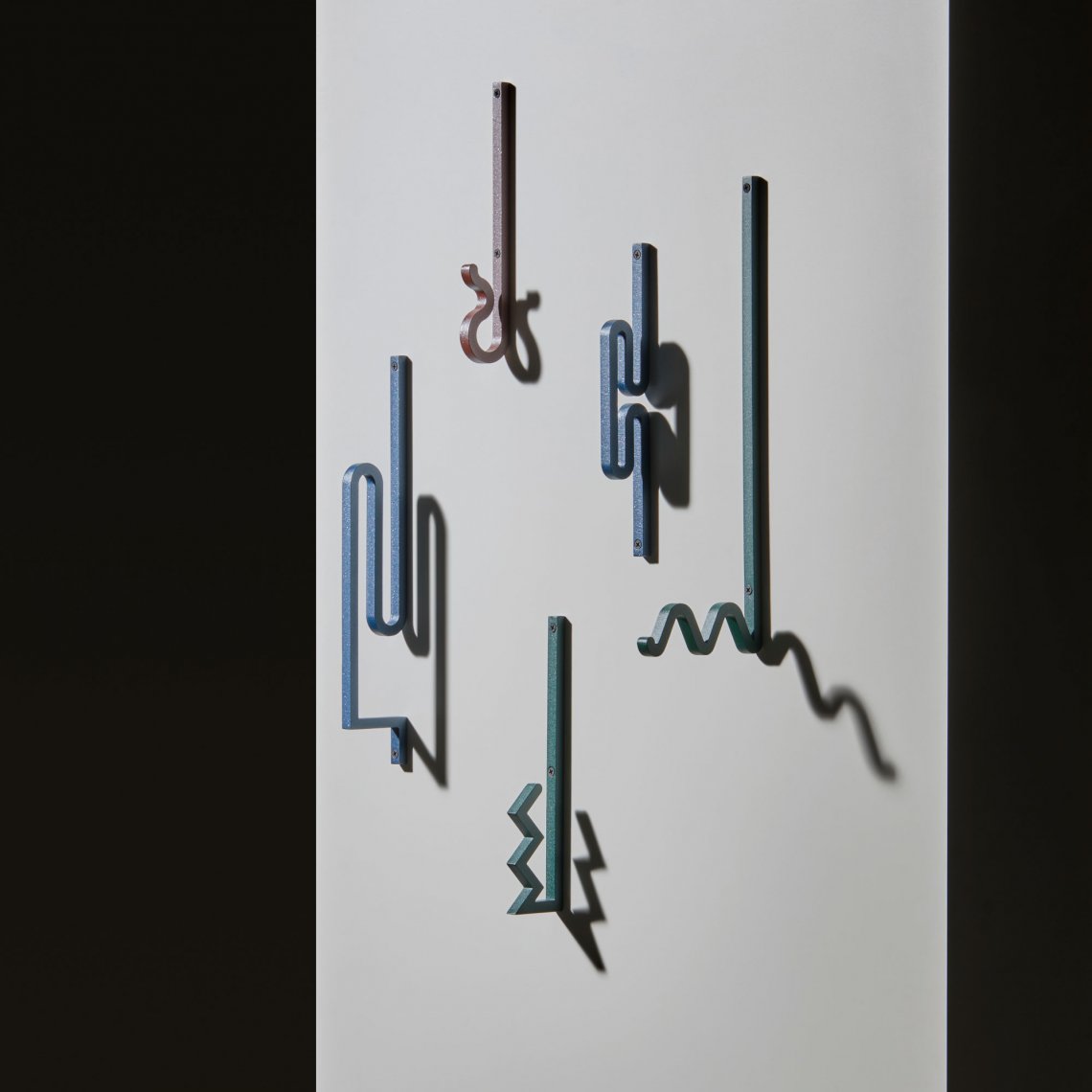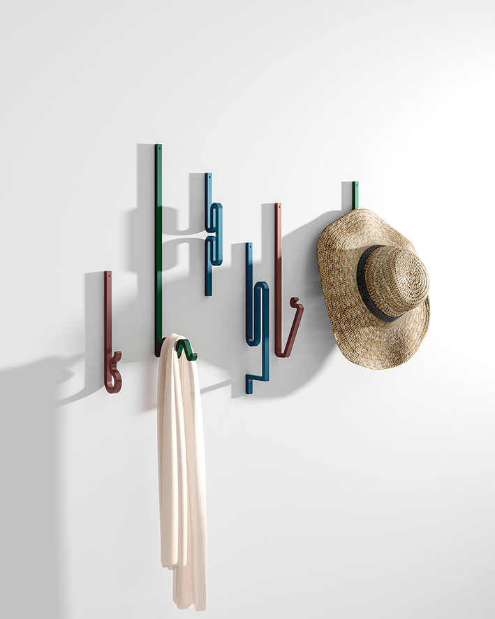 Zag is a family of coat hooks. Their varied shapes are inspired by barrettes, pins, or twisted metal rods combined to create a graphic composition. Each shape is like an imaginary letter that offers a different way to hang your clothes, your bag, or any accessory.