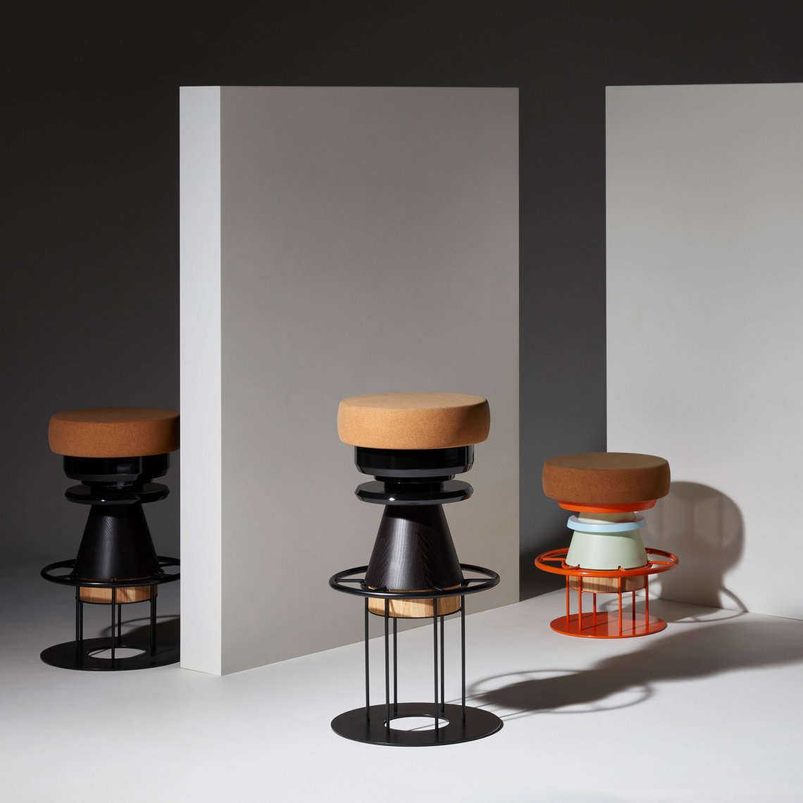 Tembo is a sculptural stool that combines a wood and metal body with a solid cork seat. The designers drew their inspiration from the African tam-tams(Tembo means elephant feet in swahili) white giving a nod to the Memphis group aesthetics.