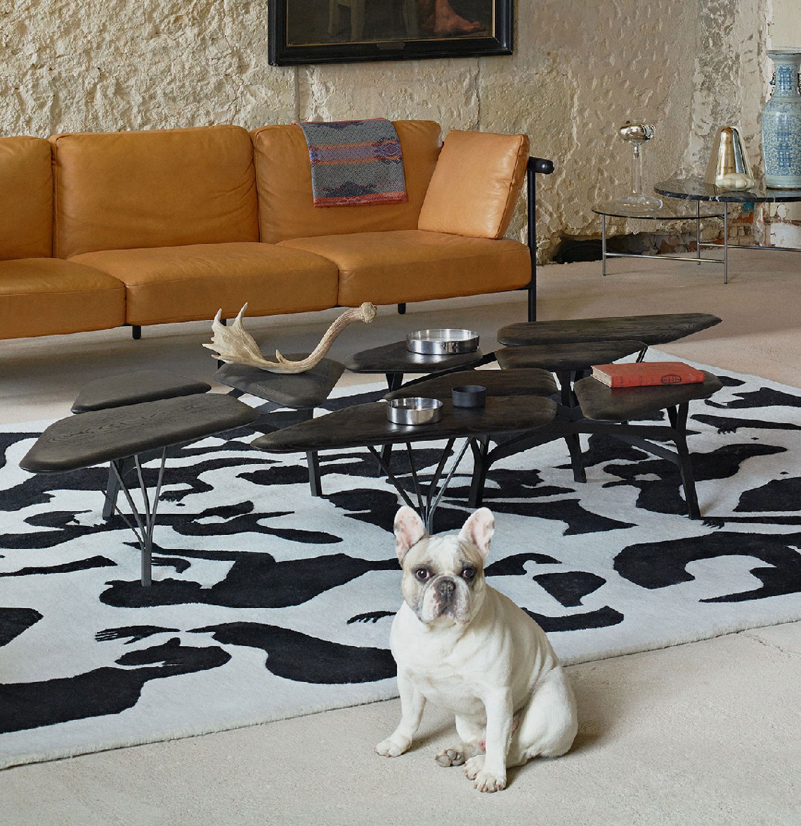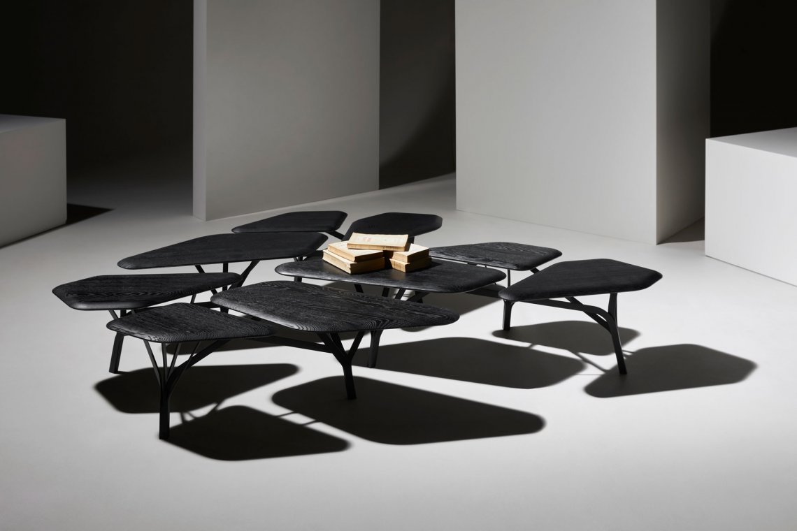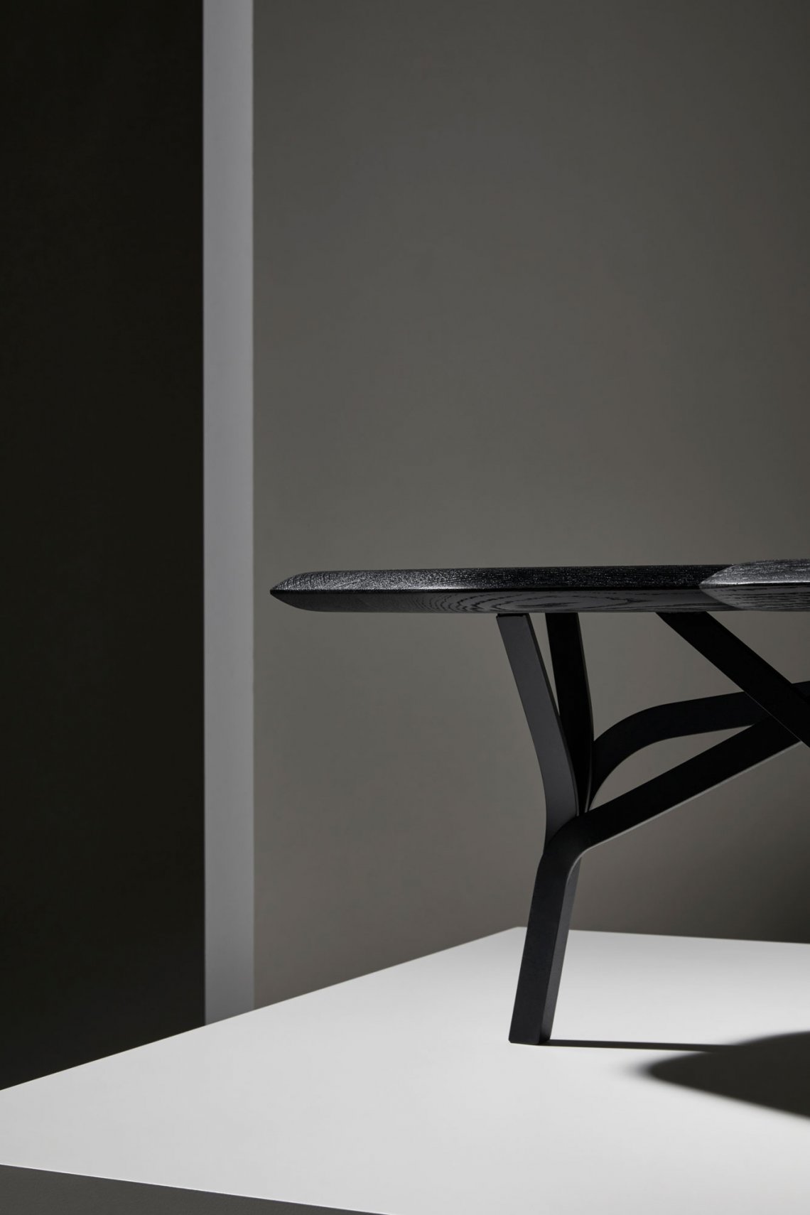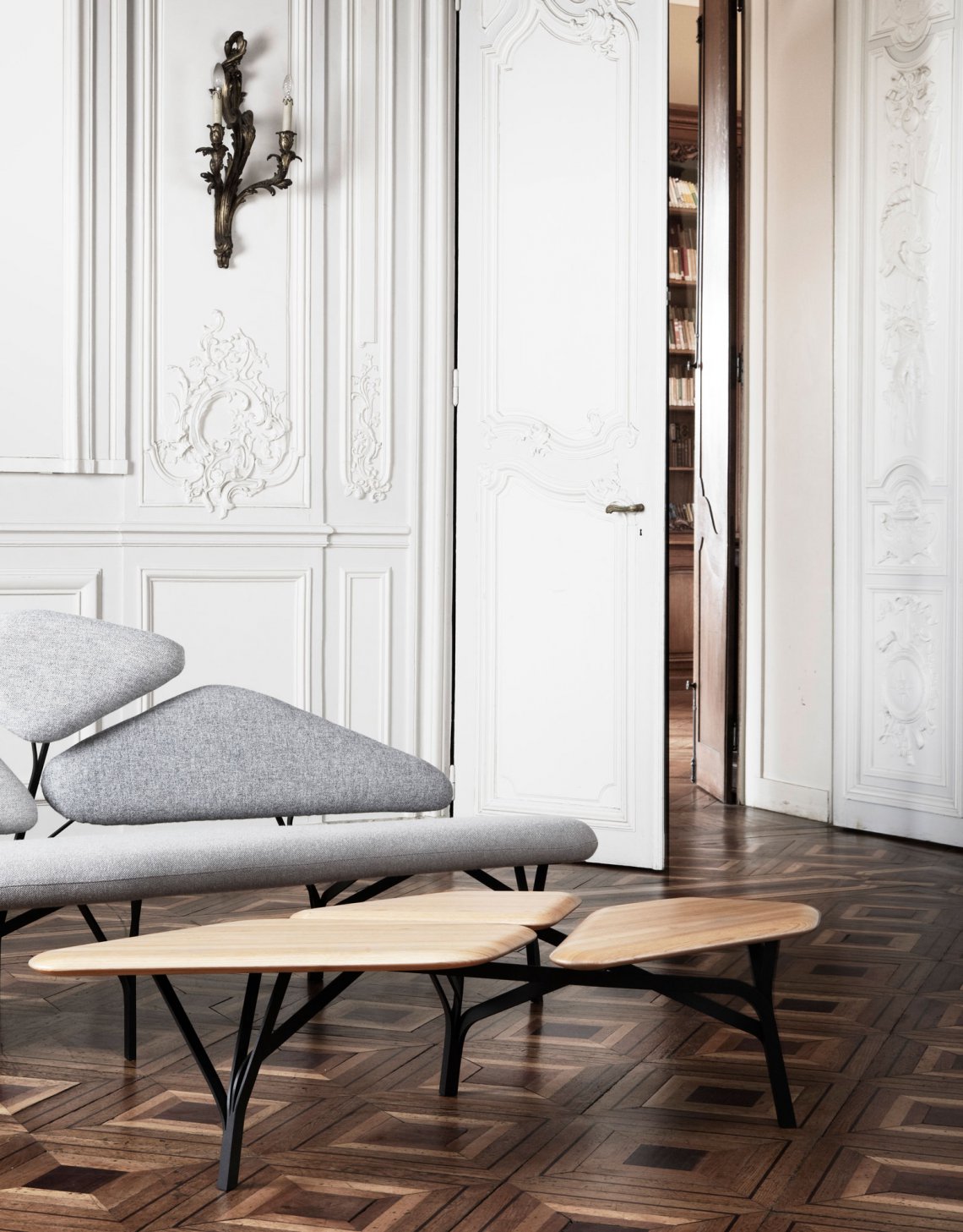 The Borghese table, as the eponymous sofa, is inspired by the umbrella pines at the Villa Borghese gardens in Rome. The characteristic network of branches is translated as a graphic steel framework supporting a trio of solid wood tops.