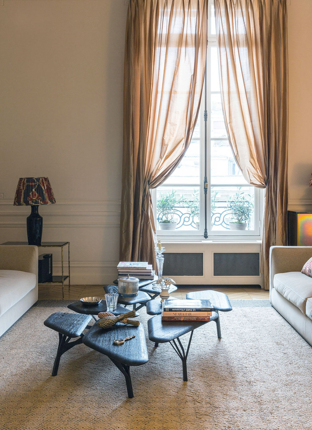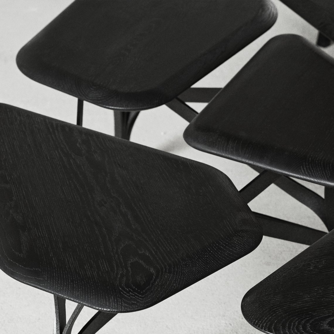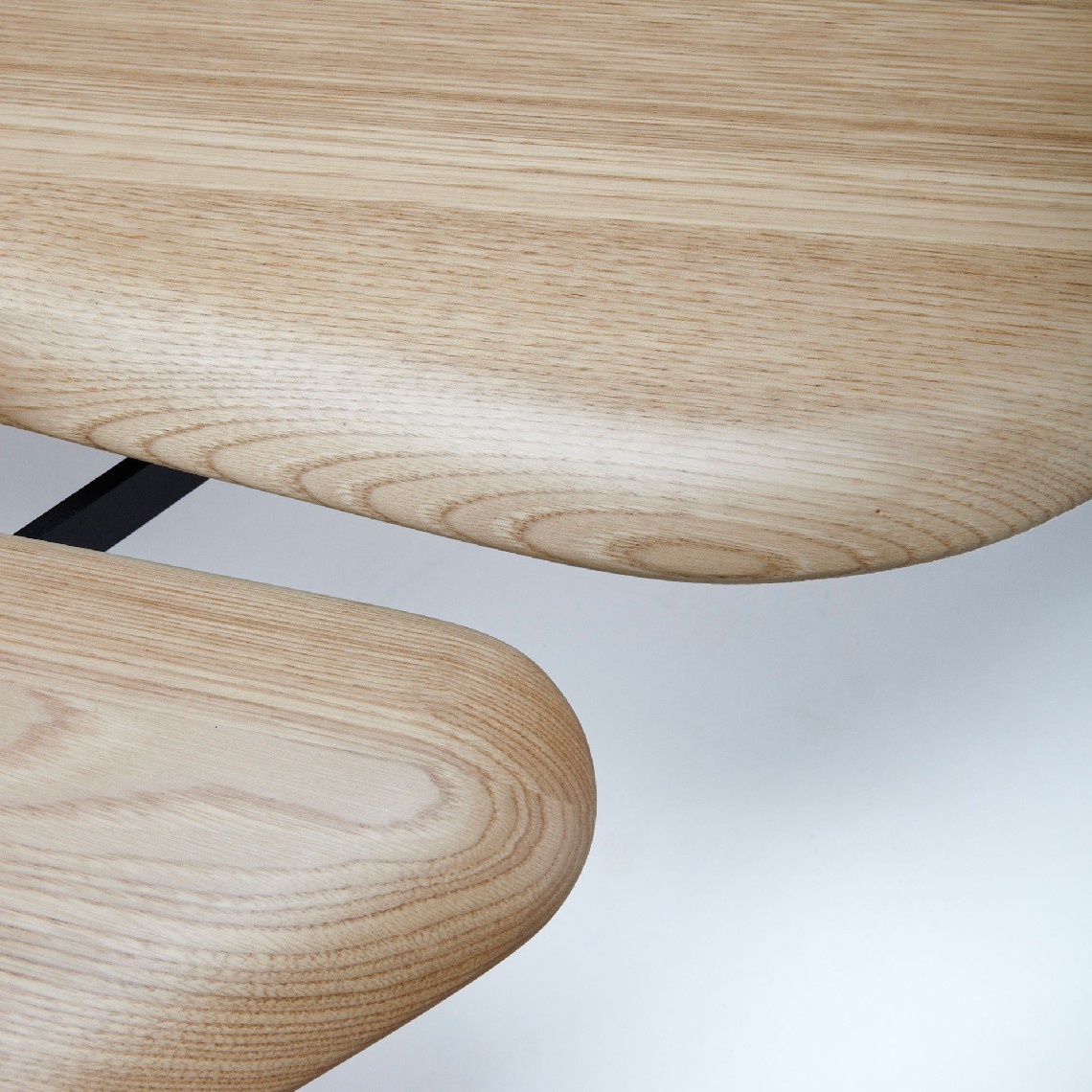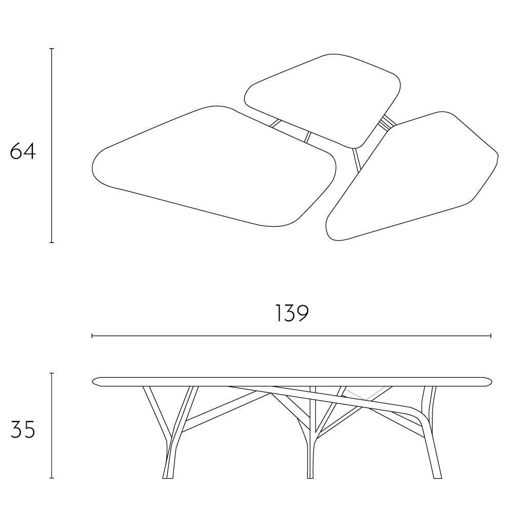 The Borghese table, as the eponymous sofa, is inspired by the umbrella pines at the Villa Borghese gardens in Rome. The characteristic network of branches is translated as a graphic steel framework supporting a trio of solid wood tops.
