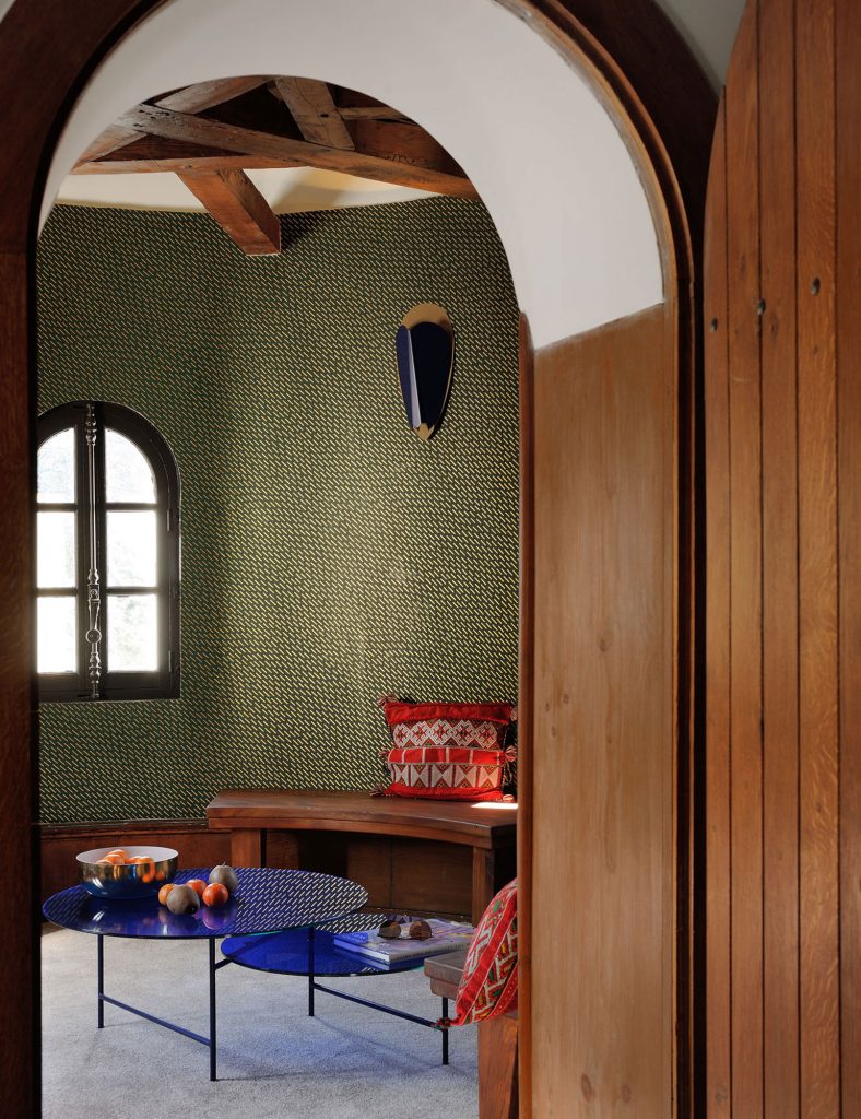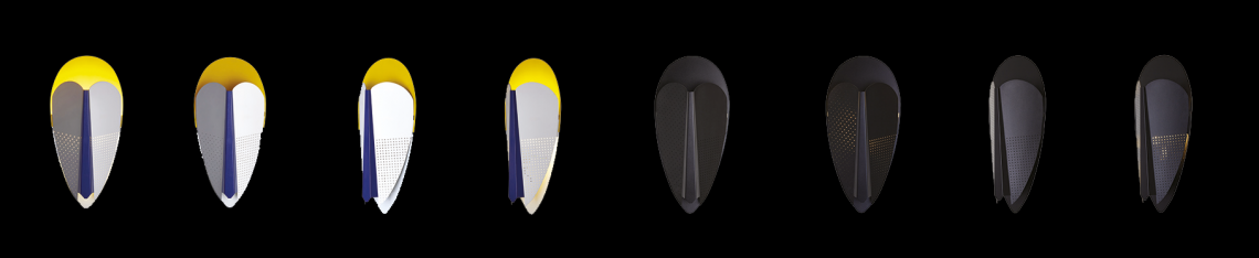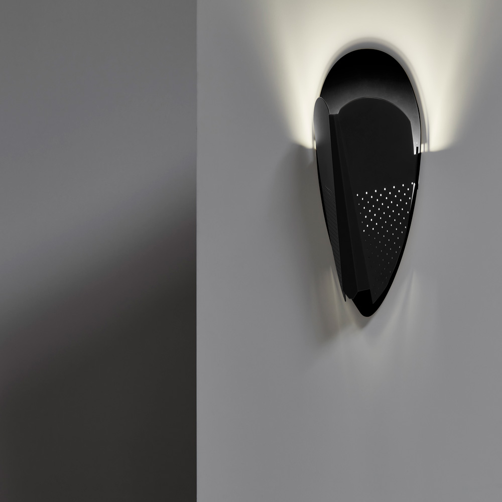 Sorcier is a wall light inspired by the ritual Ngil masks of the Fang tribe in Gabon. The light diffuses through the perforations in the mask and shines upward in a graphic and gentle way. It changes personality depending on the combination of colors, textures and perforated patterns, which vary in each version.