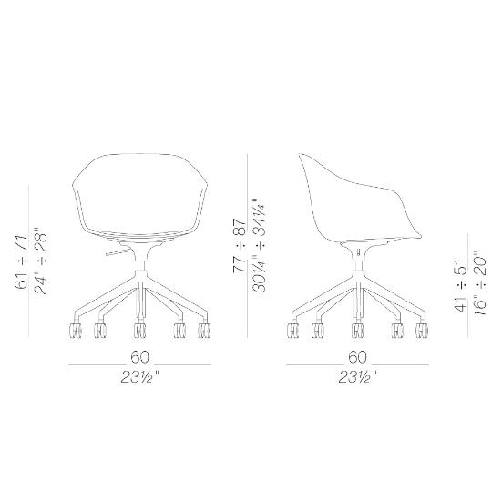 Scocca in polipropilene, con inserto integrato nella seduta rimovibile mediante 4 viti. Finiture varie con possibilità di abbinamenti tra tessuti, legno e plastiche. Disponibile anche la scocca interamente rivestita, senza inserto rimovibile.