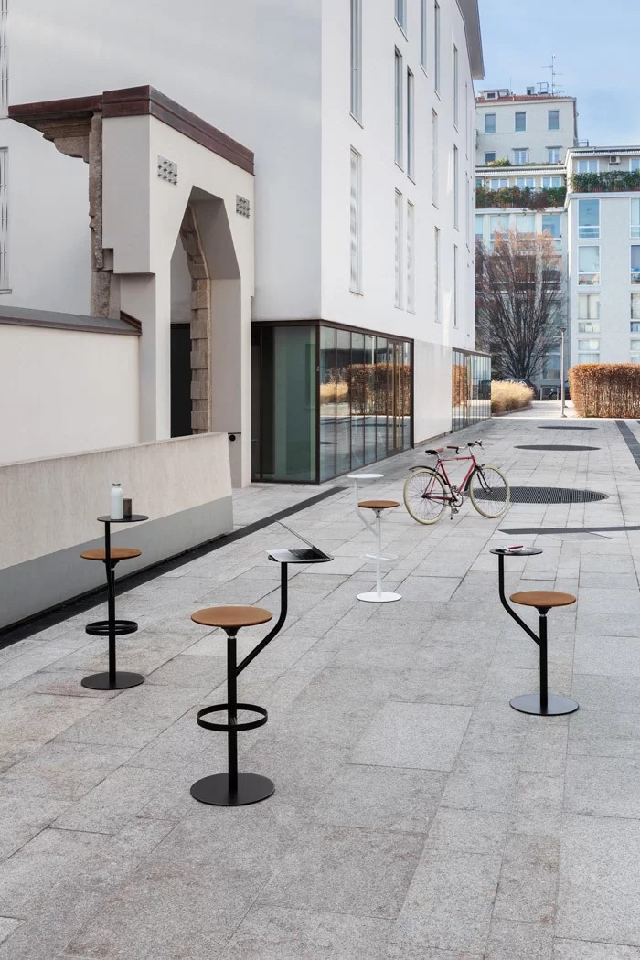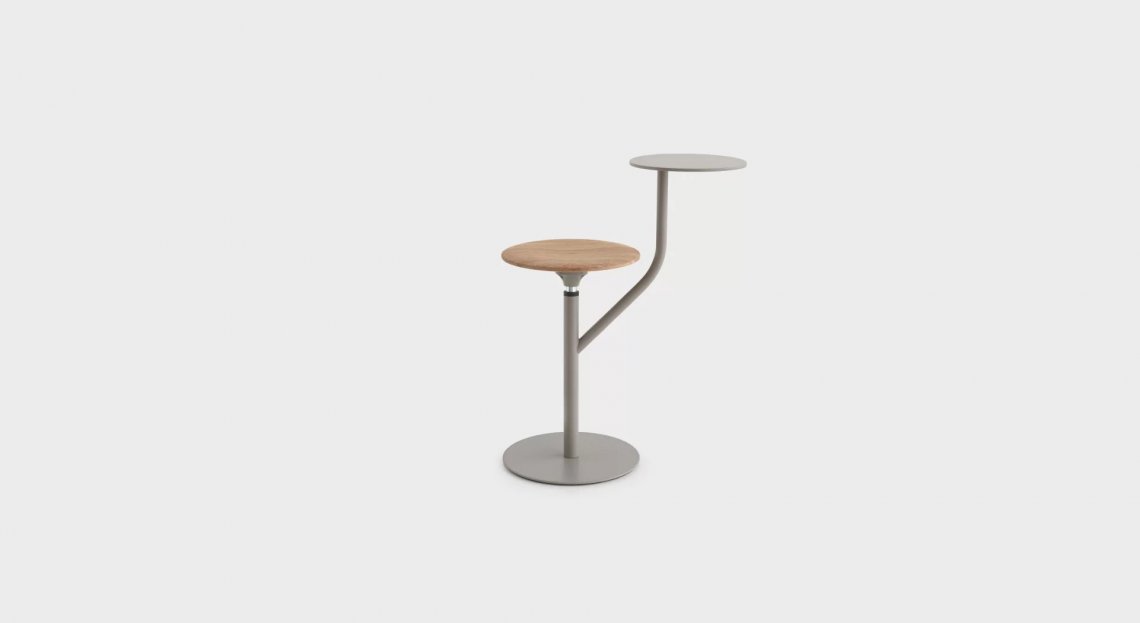 In un’unica linea, dinamica e minimale, due funzioni, sgabello e tavolino insieme. Si chiama AARON, doppia a nel nome, per sottolineare la generosità multi-tasking di un disegno che limita lo spazio d’ingombro e garantisce privacy e relax anche in ambienti outdoor. Da uno stelo in metallo, germogliano un sedile accogliente in legno Iroko e un piano d’appoggio girevole in alluminio. Funzionalità ed eleganza per arredare ambienti esterni contemporanei dedicati alla ristorazione, al lavoro o all’attesa.