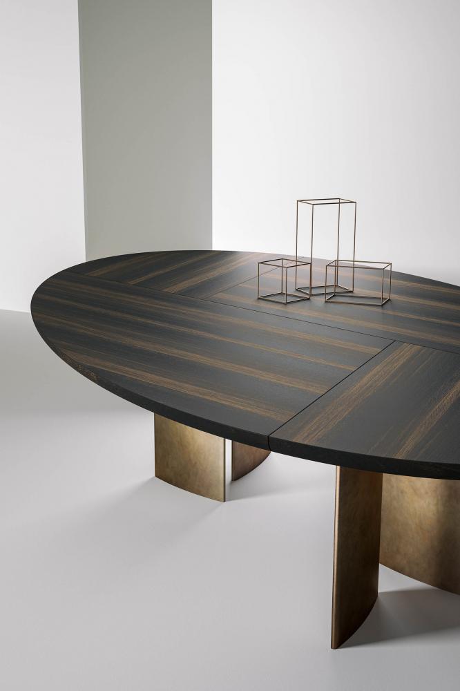 Table with rounded and inlaid top, and ovoid section legs. Available with marble, smooth wood or glossy lacquered top and with legs in smooth wood, glossy lacquered wood or lacquered with metallic paint, also covered with black rye straw inlay.