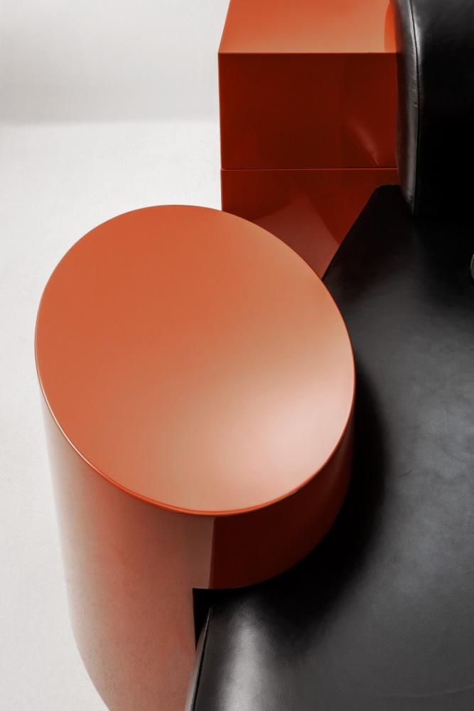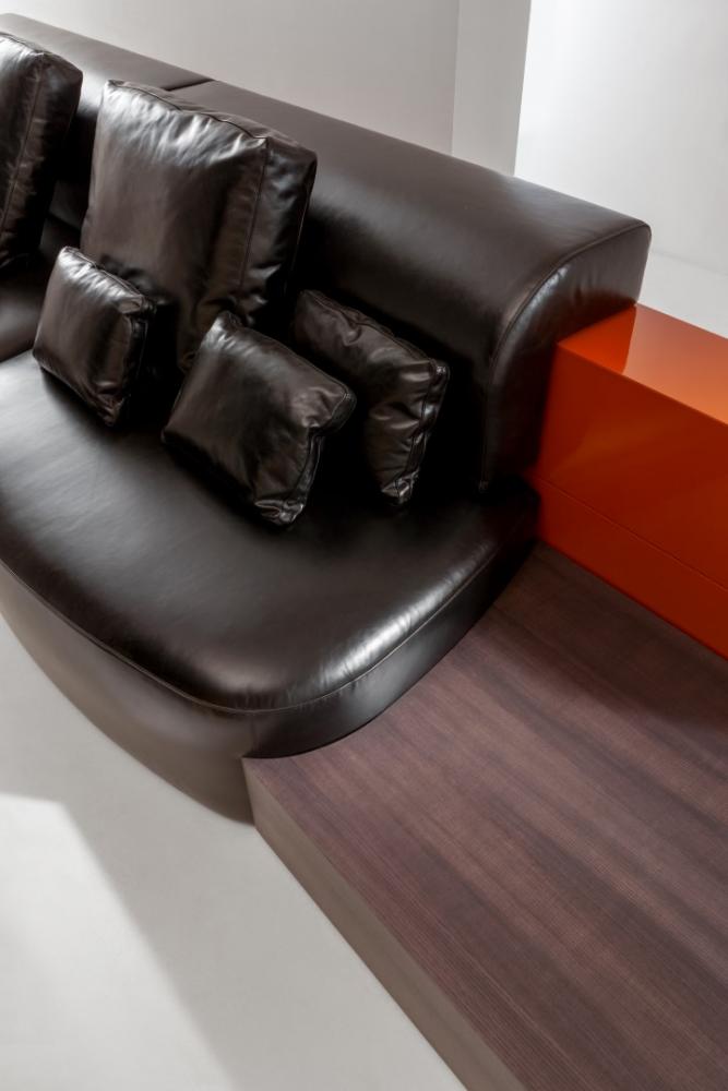 The backrest and integrated elements are available in plain, dyed, matt or glossy lacquered wood, and in various finishes from the Laurameroni collection. Decorative cushions are available.