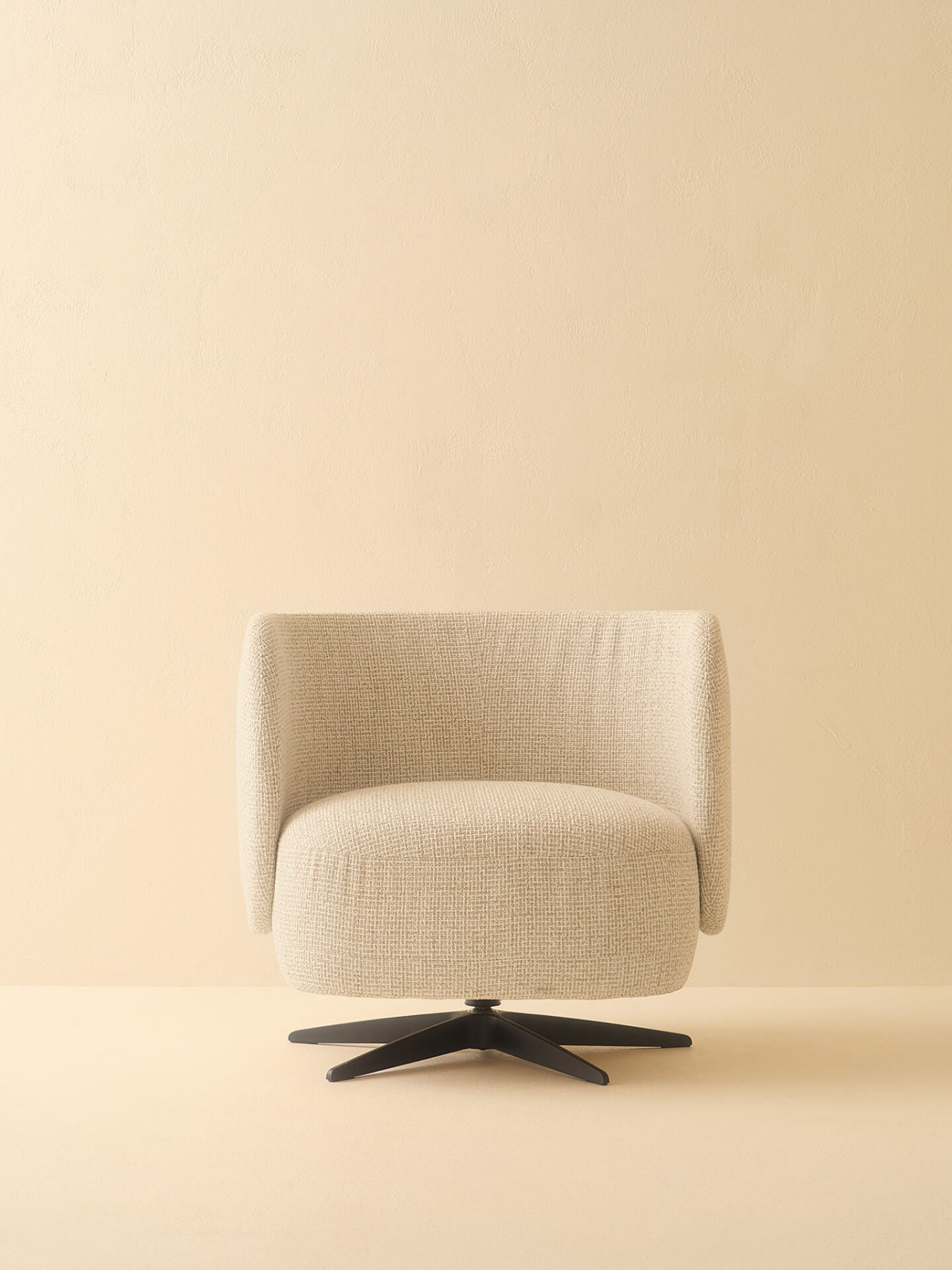 The Miki armchair designed by Pierattelli Architetture embodies the ideals of softness, comfort, and dynamism. Miki consists of a substantial seat cushion enclosed by a padded, curvilinear, and protective shell that, extending itself, surrounds and envelops the seat, serving as both backrest and armrest. With its curvilinear flow, it embraces the body, transforming the armchair into a private and welcoming refuge. Defined by its compact dimensions and high backrest, Miki elevates the central die-cast aluminium pedestal as a distinctive element, making the armchair even more versatile in its use. The armchair features a swivel mechanism that gives the seat a dynamic character and enhances its interaction with the surrounding space. Upholstered in fabric, leather, or vegan leather, Miki is a versatile and harmonious armchair ideal for those seeking a modern and refined taste without compromising on comfort and well-being.