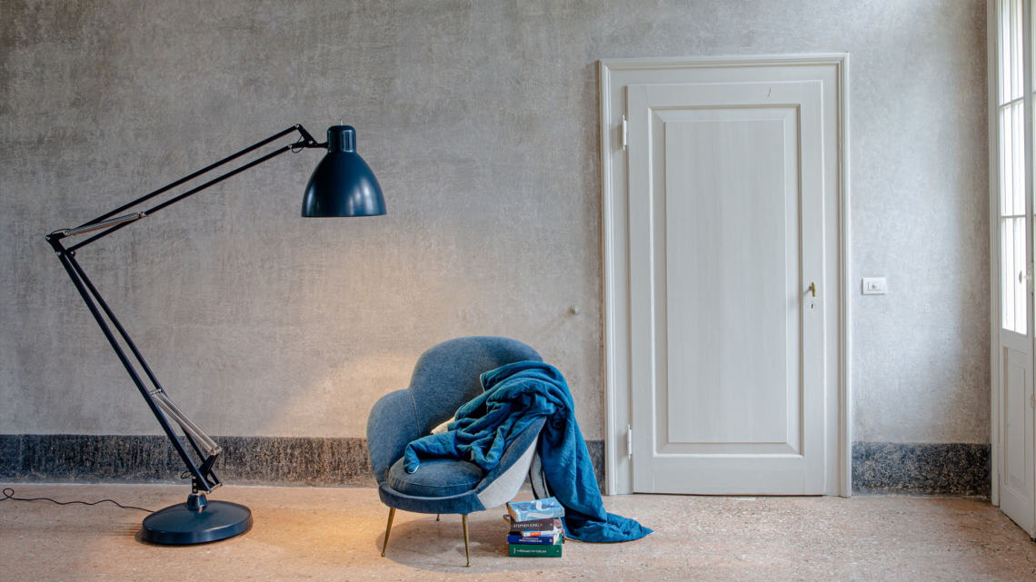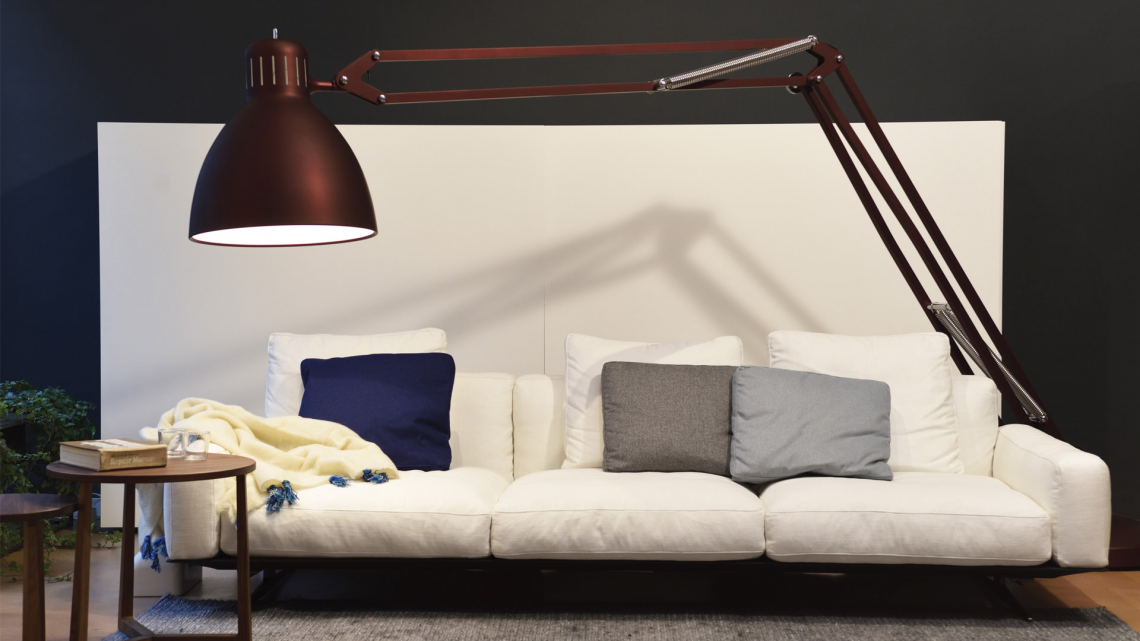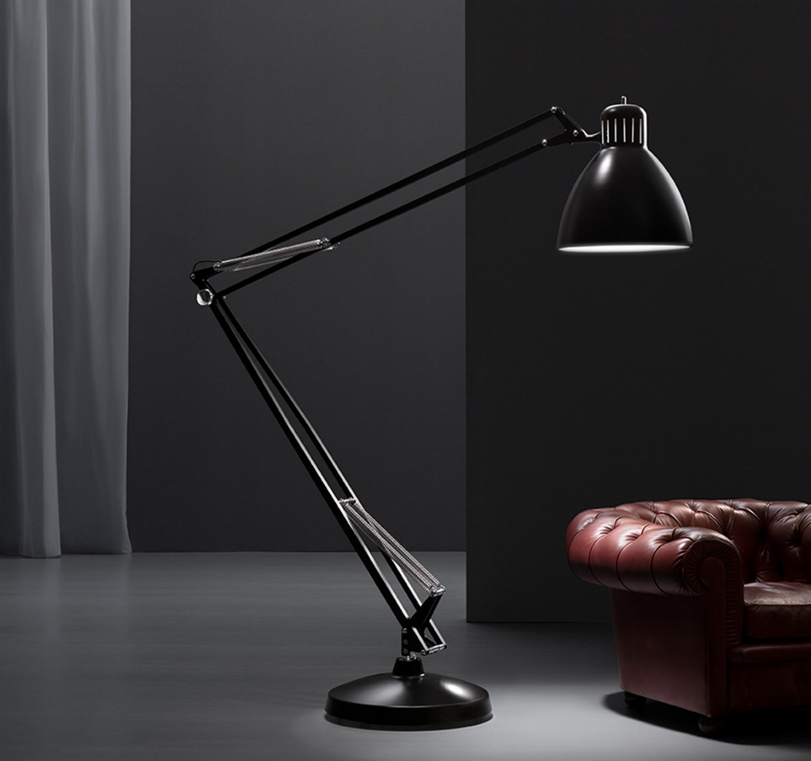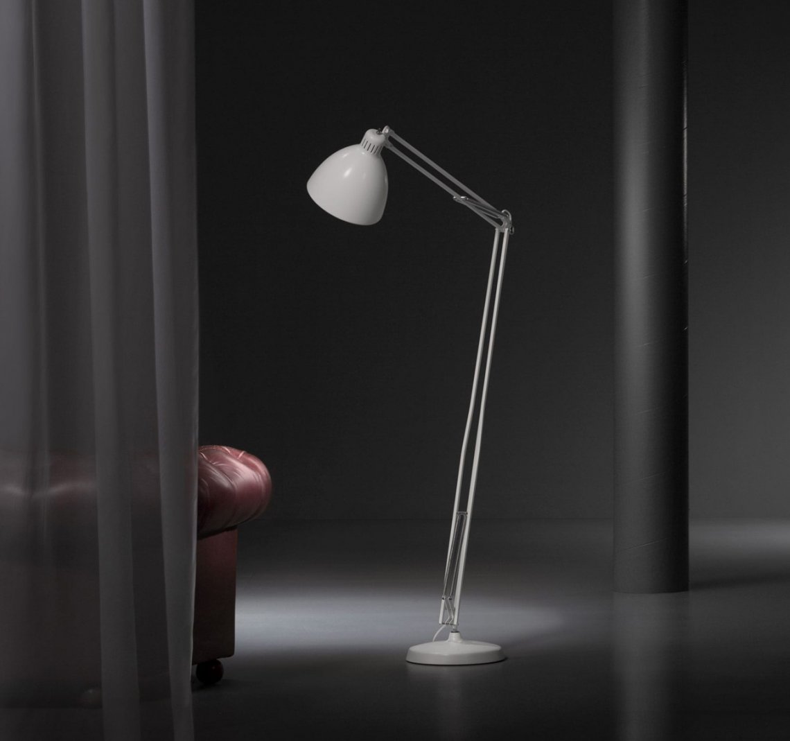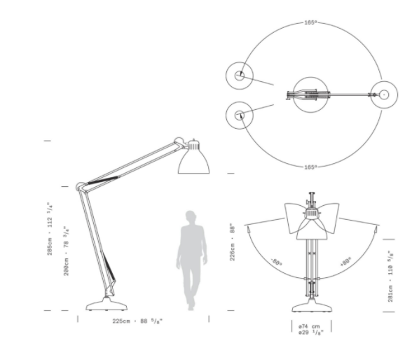 Large scale, matte lacquered, aluminum floor lamp. Available in six colors options with outdoor grade finish for maximum UV protection on both outdoor and indoor versions: white, black, amarant red, mica blue, sablé grey and rust brown with matching steel base. Interior of the diffuser in white lacquer. Custom colors available upon request. Dimmable LED light source (user replaceable). Dimmer on cord (push-dim) or with wireless CASAMBI? Smart Lighting Control.