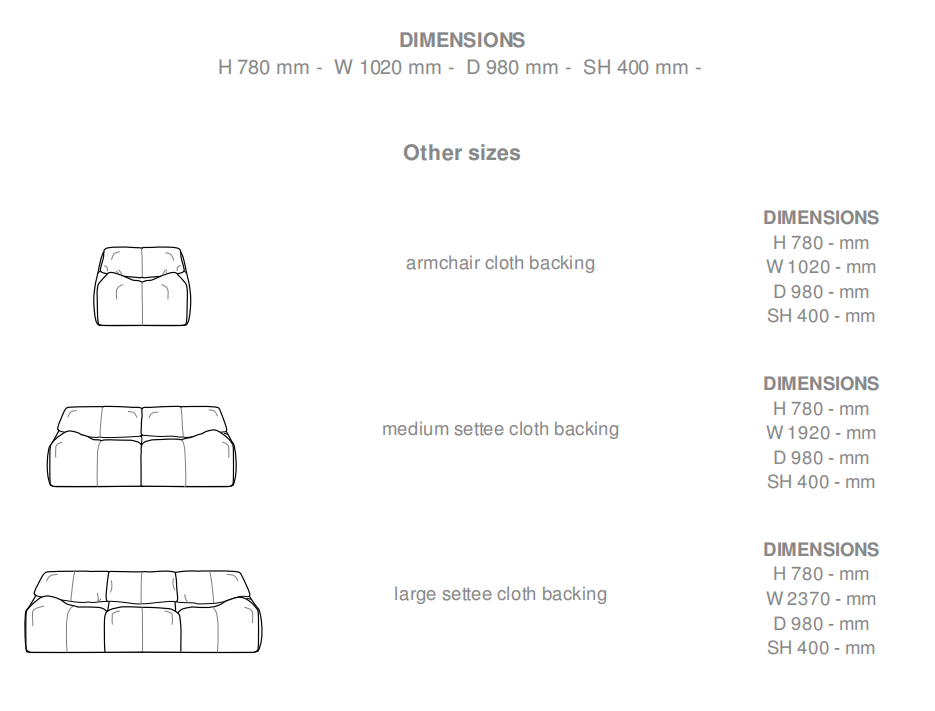 A re-edition, in January 2016, of an ''iconic'' model : Annie Hiéronimus' Plumy (1980), totally in the spirit of the Eighties and its 'couch potato generation'. 3 elements combine to provide the comfort : - uniquely-designed structure of armchair and settees made from glued-together blocks of polyether foam and Bultex polyurethane foam of different densities. - seat and back cushions filled with goose feathers (85% feathers / 15% down). - back cushions may be angled ; seat cushions may be unfolded to facilitate all manners of sitting and relaxing (chaise longue position). Thus, in 1980, one could quite rightly declare that the model Plumy was comfort with a capital ''C'' and relaxation with a capital ''R''.