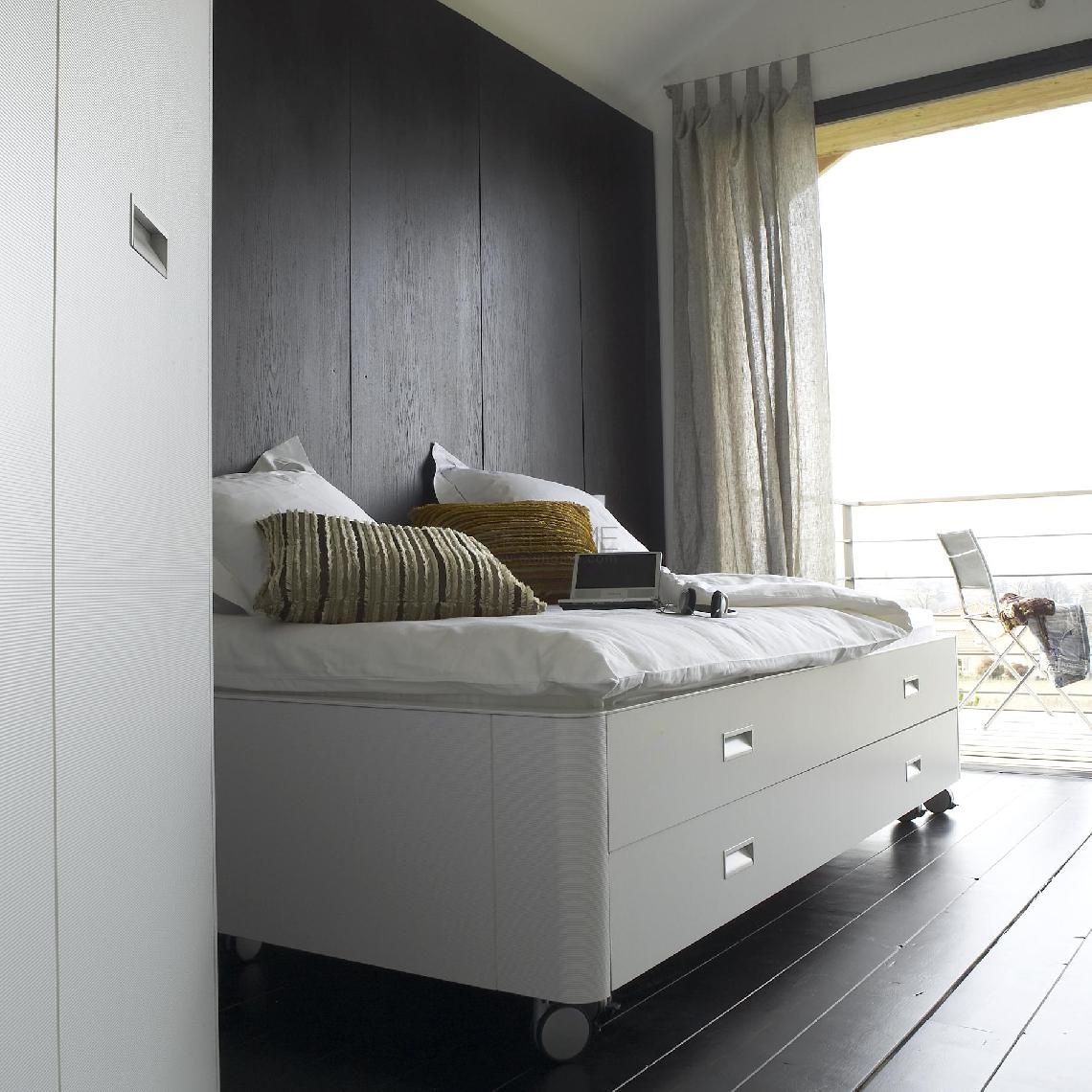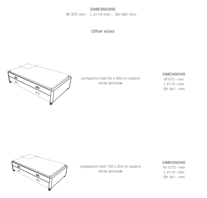 Companion bed: frame in panels of black, white laminated particleboard (ribbed on the exterior), equipped with 4 lockable castors. Intended to take a slatted base and Bultex mattress H 16 cm. Lower section can take an occasional bed with slatted base, which takes a specially adapted Bultex mattress 88 x 197 x 9 cm. When pulled out, this occasional bed rises to the same height as the main bed, thanks to its automatically-unfolding feet.