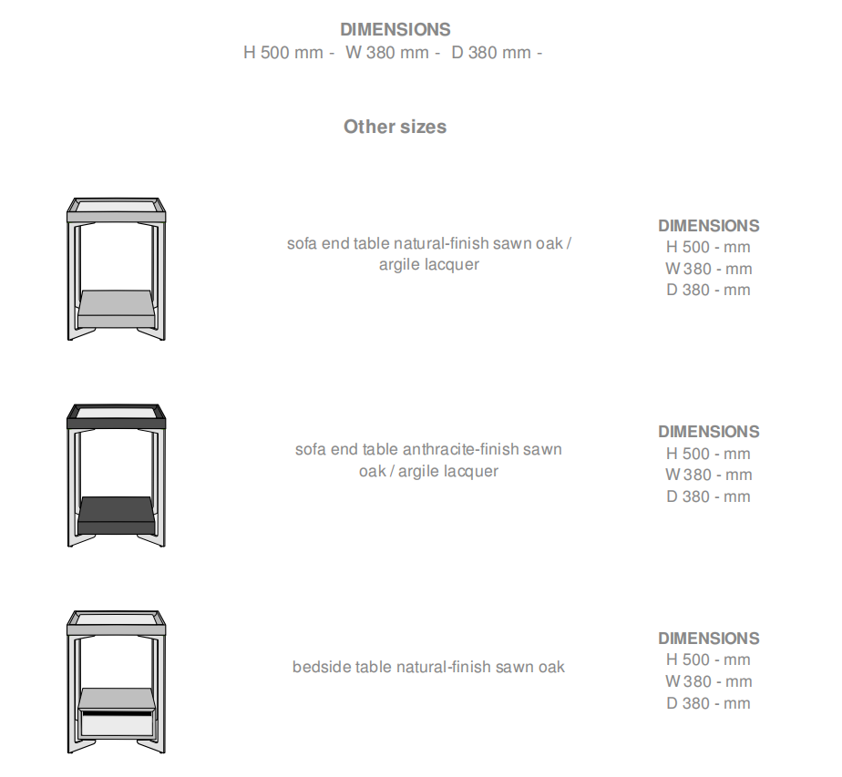 Sofa end table with base in argile lacquered steel and thick lower surface in sawn oak. The upper surface, also in oak, comprises a Pebble- coloured linoleum top glued onto a 5 mm thick HPL laminate. For ease of maintenance the raised linoleum top may be easily removed using the screws underneath. - Bedside table with base in argile lacquered steel and lower chest in argile or vieux rose lacquered sheet aluminium. The oak upper top incorporates a Pebble-coloured linoleum surface which is glued onto a 5 mm thick sheet of high pressure laminate. For easy maintenance, the raised linoleum top may easily be removed thanks to the wheels located beneath it.