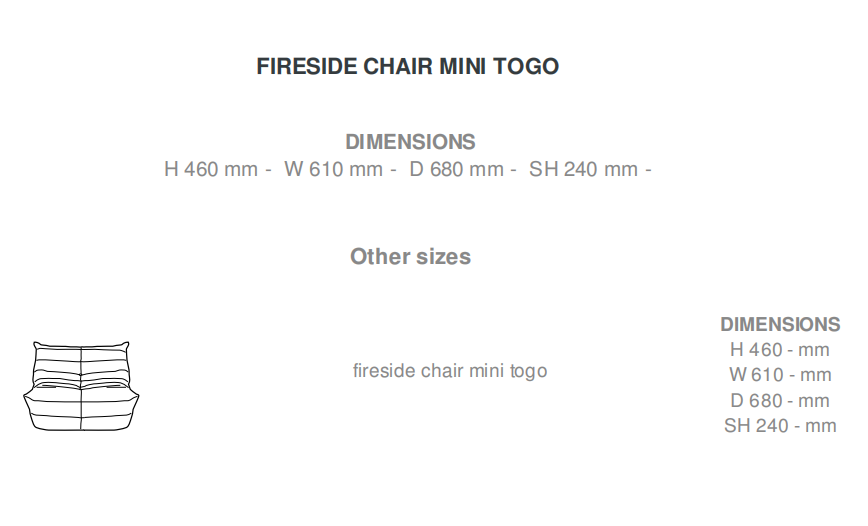 The LES MINIS collection was created to answer a general desire to 'miniaturise' adult- size seating, the characteristics of shape, comfort and safety (no hard places) of which render them attractive to both children and their parents. It was TOGO's general popularity with the public and 'all-foam' characteristics which were the deciding factors in our decision to offer this model in reduced dimensions to suit the following age groups: MINI TOGO for the 5's to 12's.