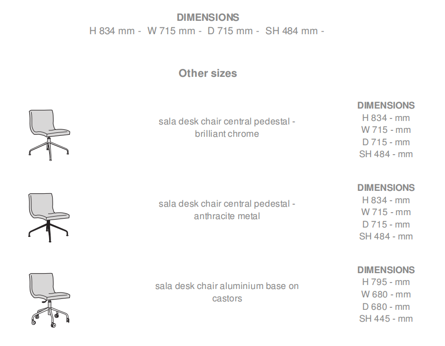 - 1 rotating 4-branch base without castors, finished in brilliant-chromed steel. - 1 rotating 4-branch base without castors, in grained anthracite-finish steel. - 1 rotating, height-adjustable 5-branch base on castors, in polished aluminium. - 1 rotating, height-adjustable 5-branch base on castors, in grained black-finish aluminium. For both chairs and bridges equipped with a 5- branch base on castors, the minimum and maximum heights and seat heights are indicated beneath each item.