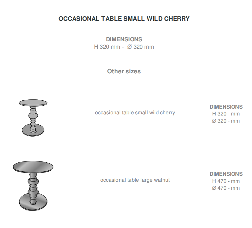 KUF is oriental in spirit, romantic and cosy. In the dialogue and opposition between the chosen materials, it is : In wood - romantic, traditional, turned ('curly'), referencing the manufacturing techniques one might find in Austria or Italy. In aluminium - it becomes industrial, referencing the manufacturing techniques of the Orient or India. - Pedestal table in natural satin varnished solid cherry (European cherry). The diameter of the base is 27 cm. - Pedestal table in natural satin varnished solid walnut (American). The base (diameter 42 cm) incorporates a weight in Epoxy black lacquered steel.
