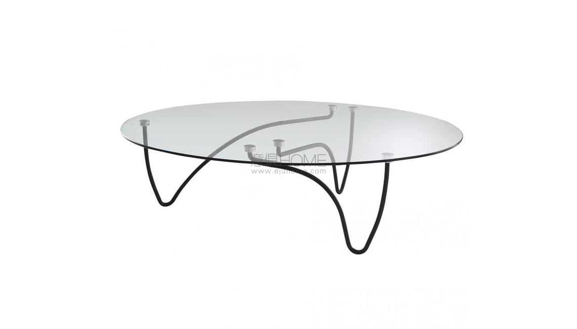 Top in 8 mm thick clear toughened glass. Matt lacquered circular steel base ? 15 mm. Plates (? 35 mm) to take the base are glued to the underside of the top.