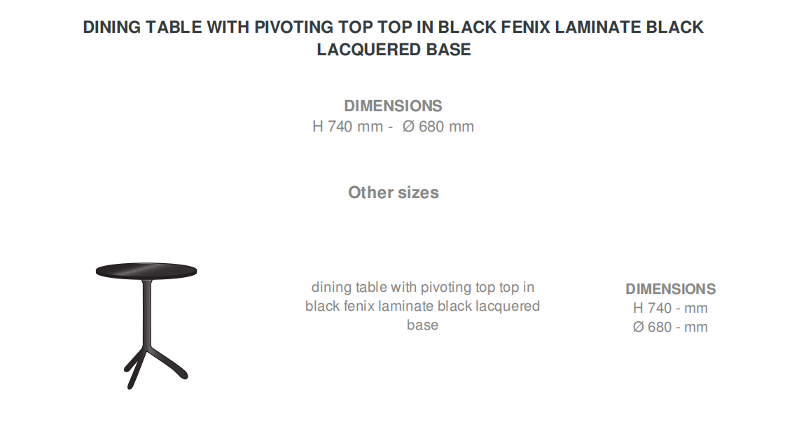 CONCEPT: Usable both indoors (in the corner of a kitchen, occasional pedestal table) or outdoors (on a terrace or in the garden), the Noomi table combines a minimalist lacquered steel base with a round top made from Fenix HPL laminate. This table is characteristic of the tables found in pavement cafés, yet in a modernised, pared- down form. Its folding top brings added compactness, enabling it to be stored more easily when not in use, or protected from bad weather when used outside. QUALITY OF MANUFACTURE: Base in black or white lacquered (outdoor-quality, double layer) laser-cut steel with textured finish. Circular top in 10 mm thick black or white Fenix HPL laminate (indoor use) folds for ease of storage. Robust mechanism in outdoor-quality charged polymer.