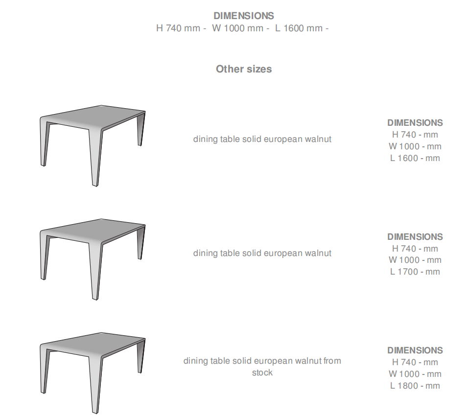 CONCEPT: In the case of the Spirit of Forest table, Peter Maly almost lets himself become lyrical, complementing the rectangular top with softly sloping trapezoidal legs. The rounded shape of the top's extremities also helps soften the severity of the walnut. The comfortable 100 cm width of the top may be perfectly customized with a choice of 9 lengths, from 160 to 240 cm (gradations of 10 cm). QUALITY OF MANUFACTURE: dining table entirely made from natural varnished solid European walnut. Decorative finger joint detailing at junction of legs and top. IMPORTANT: the dimensions indicated are those of the top. When calculating the total area of the table, 8 cm should be added to the length (owing to the slope of the legs).