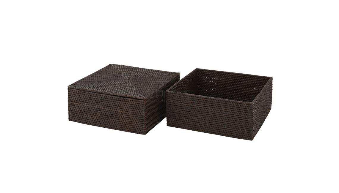 Set of 2 baskets made of chocolate color braided rattan, with matte finish. Only one of the 2 baskets comes with a lid.