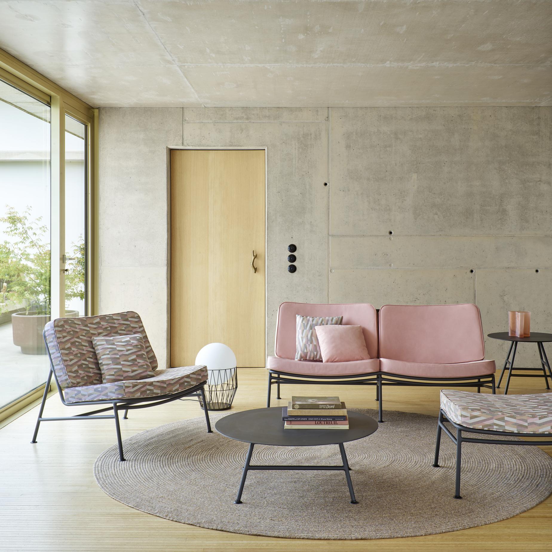 Backpack, the collection of seating designed by the LucidiPevere design studio, has a brand new look. Now with lesser dimensions than it had at its first outing in 2017, it is available in an indoor or outdoor version. Consisting of a 2-seat settee, armchair and footstool, this collection makes a real design statement. There is a complementarity between the various materials used: the structure in charbon-lacquered aluminium and the seat covered in a technical fabric show to best effect its informal lines and welcoming, ergonomic curves. Central to this creation are the colours, always sombre, which are evocative of walks in the countryside. Finally, the soft cushions made using specific fabrics serve to augment the sense of comfort. A range which surprises as much by its simplicity, evident at first glance, as it does by its lightness, which is not only visual but also real.