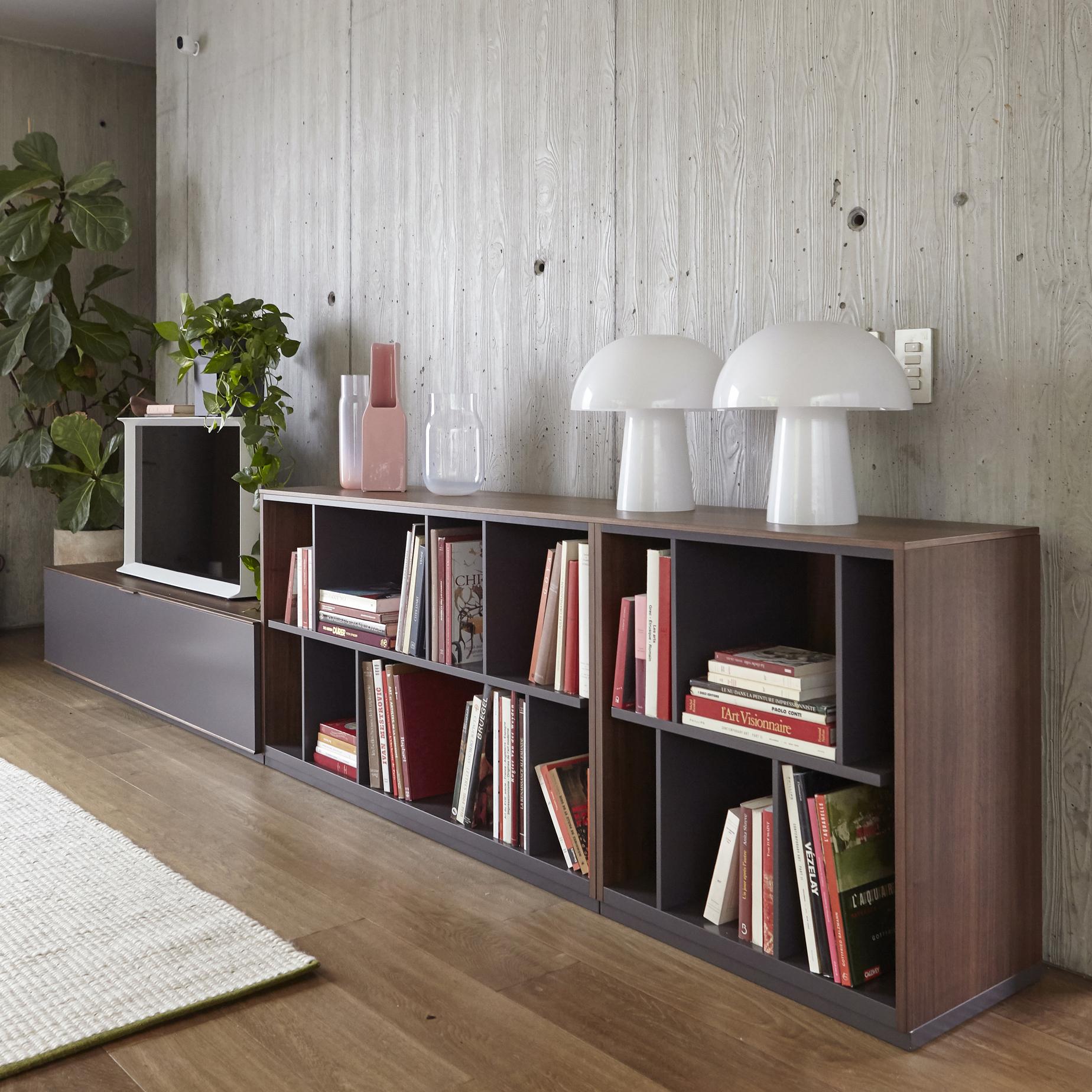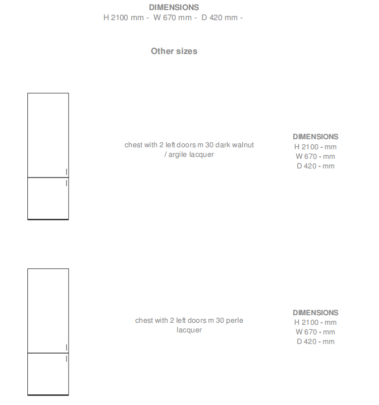 CONCEPT & DESCRIPTION : “Canaletto’s modular nature opens up new horizons in terms of containing, but also displaying, showcasing, demonstrating...Open or closed modules and staggered vertical separations confer remarkable graphic lightness reminiscent of the tableaux of the view painter Canaletto. The closed chests are given substantial and extremely significant character in the profiling, both horizontally and vertically, of the flap doors and drawers, thanks to the profiled uprights and projecting handles in ‘Canaletto walnut’. These finishes transform a furniture system into a jewel with a unique spirit which draws the attention to the manufacturing details and a refined appearance. With Canaletto, putting together a composition will no longer be a puzzle or a series of difficult choices between function and aesthetics. Canaletto is an essential expression of a tranquil design response to the practical demands of modern life.” Mauro Lipparini An elegant modular range combining lacquer with solid wood. Note the quality of finish as embodied by the dark walnut lip which serves as a handle for the doors. It responds perfectly to contemporary requirements of a modular system, offering solutions for hi-fi and storage, plus shelving and a sideboard. Items are created by juxtaposing elements. Once the structure is defined - H 50 (TV unit), H 75 (sideboard), H 145 or H 210 then W 67 or W 135 – it can then be completed in a number of ways. Shelving can be located in the lower section with a door above, or vice versa. One could also have full-height shelving, or even close the space completely. The end result of this is an undeniably original style with a powerful identity. The shelving can be equipped with 2 or 3 optional illuminated vertical separations (predefined) to provide refined, indirect LED lighting (LED ribbon, glued in place, with a reflector which slides along the vertical panel). The double doors have the unusual feature of having only one handle on the right-hand side. This touch of visual lightness is all part of the overall minimalism. The left-hand door may be opened via a finger-hold on the edge once the right-hand door has been opened. Wooden elements incorporating slim aluminium shelves may be used to dress a wall. If these are extended towards the floor by an additional wall panel, a complete wall panel is created. A choice of 3 widths is on offer. These wooden elements may be complemented with illuminated LED strips which are located towards the top and across the width of these wooden elements. With his sense of proportion, and with the rhythm and looks he has brought to it, Lipparini’s new modular range is both luxurious and high-end. Thanks to its simplicity, it is immediately comprehensible. The lacquer colours have been selected with care : elements may be plain, in either plomb or perle lacquer, or these two lacquer colours may be combined with dark walnut veneer. Argile lacquer is always used in combination with dark walnut and interiors of chests in argile lacquer are always in plomb lacquer. The doors come with a vertical solid walnut lip to both left and right. The shelves are perforated on the sides. The subtle nature of the indirect LED lighting, and the addition of a glazed element (green- coloured, H-shaped) in the shelving unit reinforces the understated elegance of the alliance of materials. Probably one of the best-finished ranges in our collections, this is a real work of cabinet-made art.