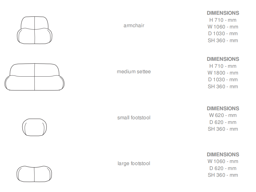 富有創(chuàng)意的產(chǎn)品,為眼睛和臀部帶來極大享受。普卡系列非常舒適,是設(shè)計(jì)上的奇跡,其起源可追溯到偉大的 C&B時(shí)代,當(dāng)時(shí)Gaetano Pesce于1969年推出了UP50系列,他創(chuàng)造了一個(gè)向海綿致敬的系列,Gaetano Pesce 說自己被淋浴間的海綿迷住了,因?yàn)樗偸悄芑氐皆瓉淼男螤睢?雅布·卜舍勒貝爾(Yabu Pushelberg)秉承了這一主題,增添了女性化、柔軟和有機(jī)的設(shè)計(jì),使空間充滿感官舒 適感。 與雅布和卜舍勒貝爾的新合作將其先進(jìn)的設(shè)計(jì)理念與我們的制造技藝相結(jié)合。接縫的細(xì)節(jié),超柔軟泡沫的使用以 及線條的張力使我們不得不考慮使用完美的布料,而只有我們最具彈性的面料:Arte、Maxi、Gentle、Moby和 Appa才有可能滿足制作要求。特別是新型的Gentle面料,它是100%有彈力的羊毛織天鵝絨,能完美符合設(shè)計(jì)要 求。 結(jié)構(gòu):不同密度的泡沫,底座由高彈性的聚氨酯泡沫(48 kg / m3 -7.1 kPa)制成。 舒適度:靠背由高彈性的Bultex聚氨酯泡沫(26 kg / m3 -1.4 kPa)制成,并覆蓋有超柔韌性的聚氨酯泡沫(50 kg / m3 -1.8 kPa) 座椅由高彈性的聚氨酯泡沫Bultex制成(38 kg/m3 - 3,6 kPa 和 38 kg/m3 - 2,8 kPa),上覆蓋超柔軟的聚氨酯泡 沫(50 kg/m3 - 1,8 kPa) 。 縫紉/罩布:應(yīng)該選擇具有彈性的面料 可由專業(yè)人士拆卸
